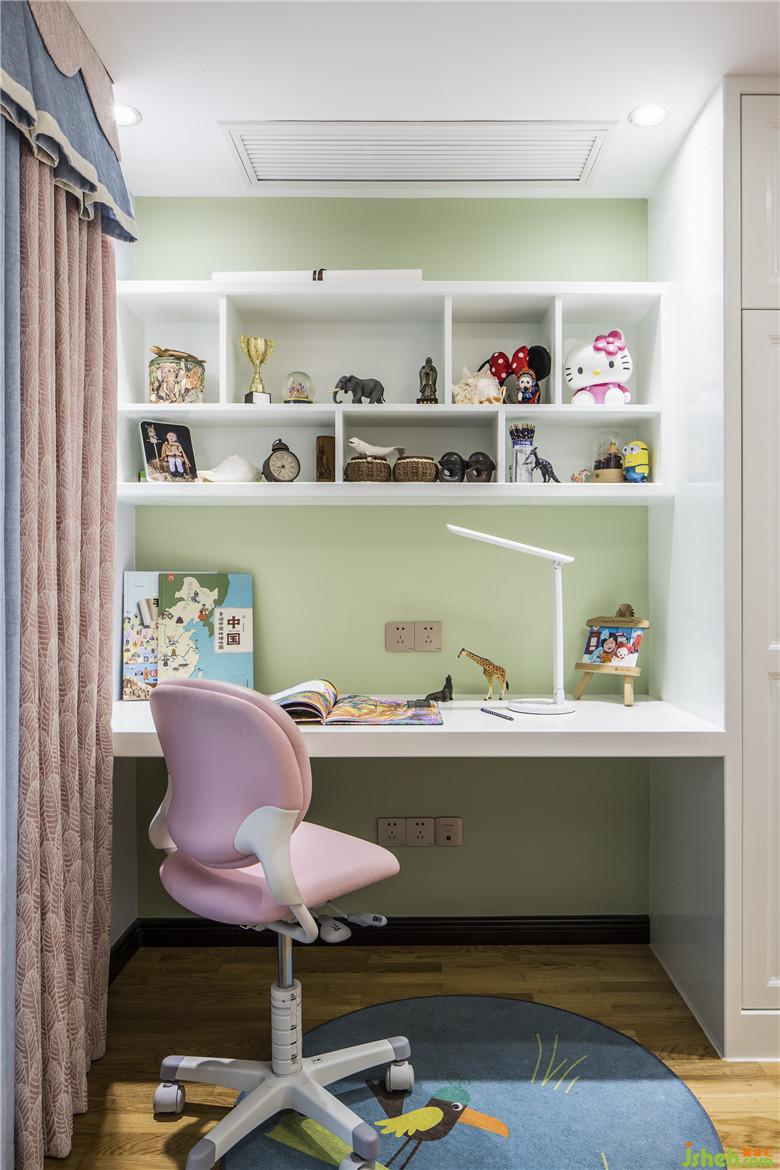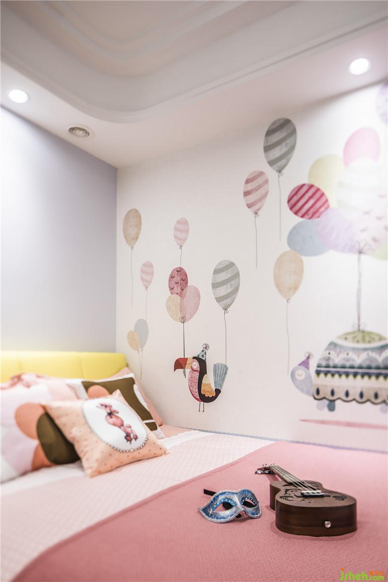 儿童房以清新的粉绿色与粉红色的搭配来凸显空间氛围甜美与可爱,随处可见的动物元素和气球、城堡,为孩子构建了一个童真童趣的空间。