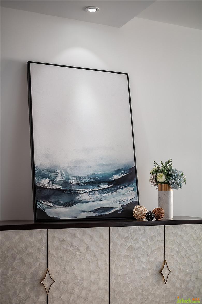 门厅处,手工创作的海浪抽象摆画和贝壳面材质的装饰柜仿佛带来了一丝海风的清冽。
