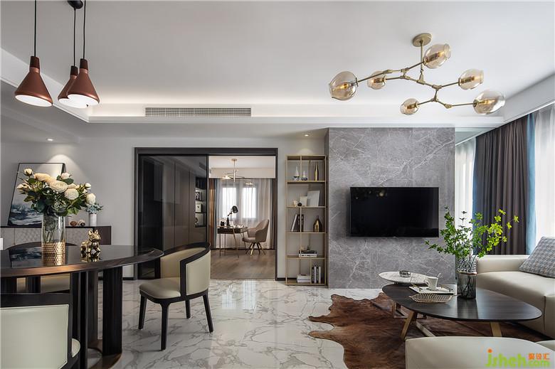 客厅墙面,刷漆壁布的运用,在被赋予了富有肌理的触感的同时,还回避了后期墙面炸裂的尴尬。非常耐用且易于打理。电视区域,石材和壁布的搭配。室内设计师让墙面显得干净利落且层次有序。
