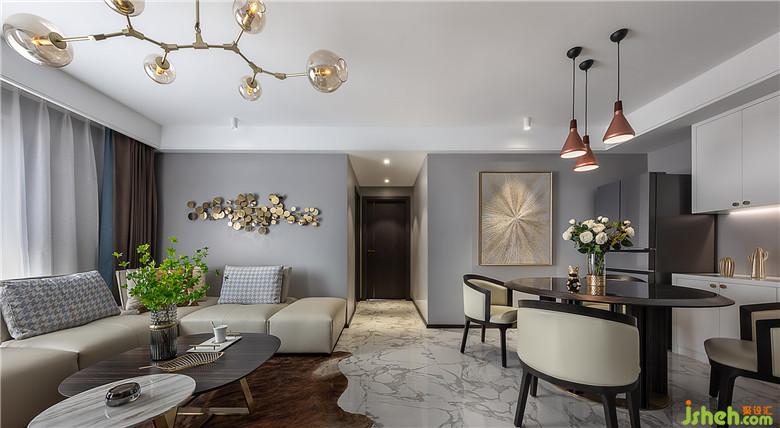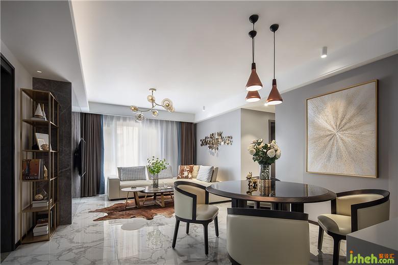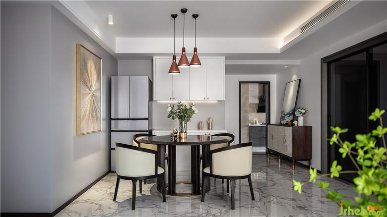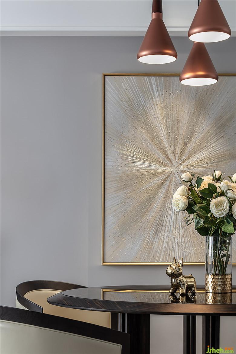 餐厅墙面的金色放射状抽象画和铜质的吊灯,也给整个用餐区域增添了一些贵气。
