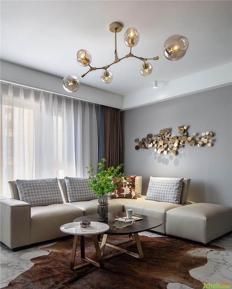 沙发造型简洁,边沿折痕状态的褶皱颇有手工之趣。沙发背后的金属壁挂和黄铜材质的吊灯相得益彰。餐椅的曲线靠背有一丝复古的温和,让由直线构成的空间里有了一些温情。