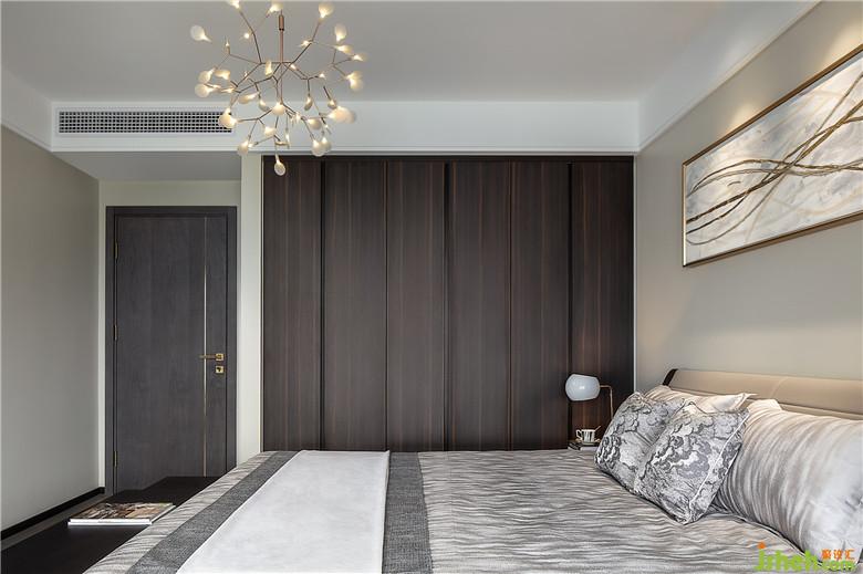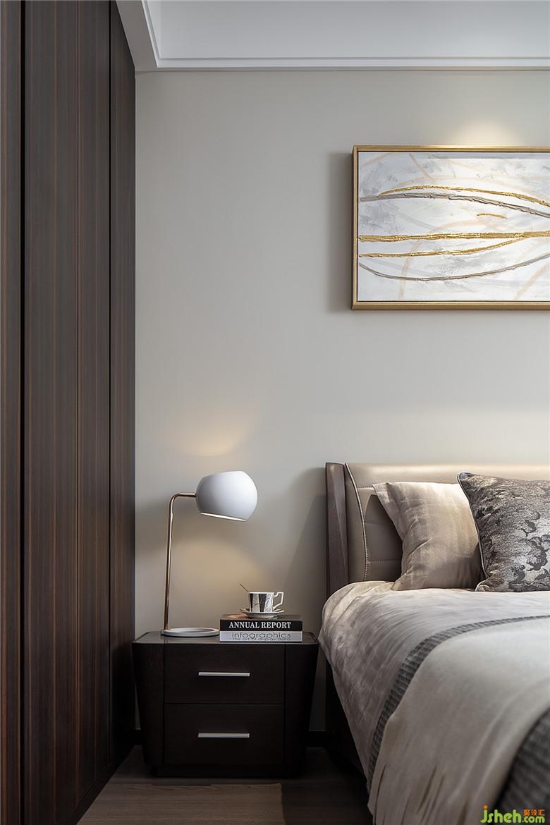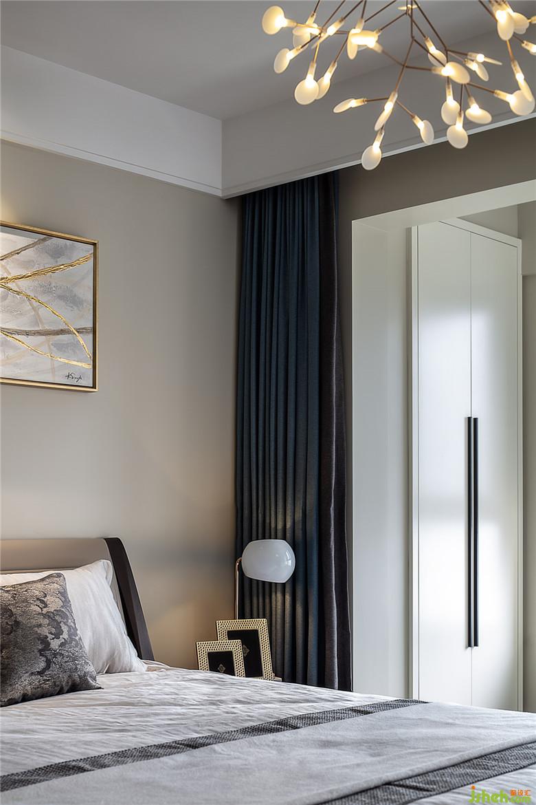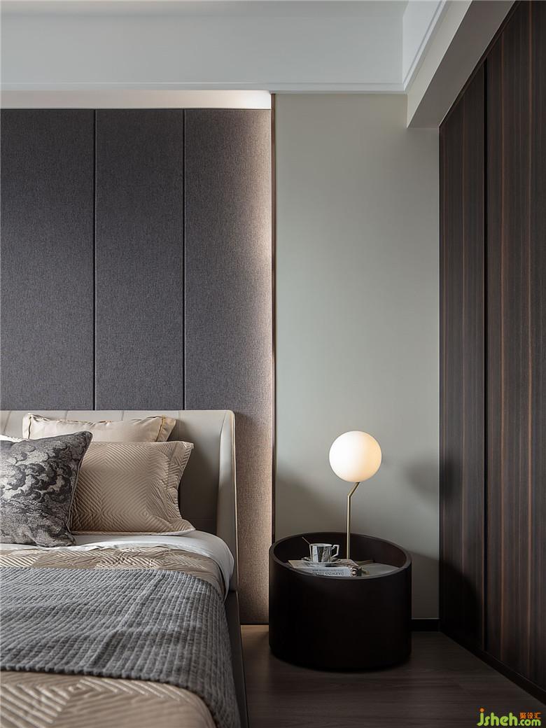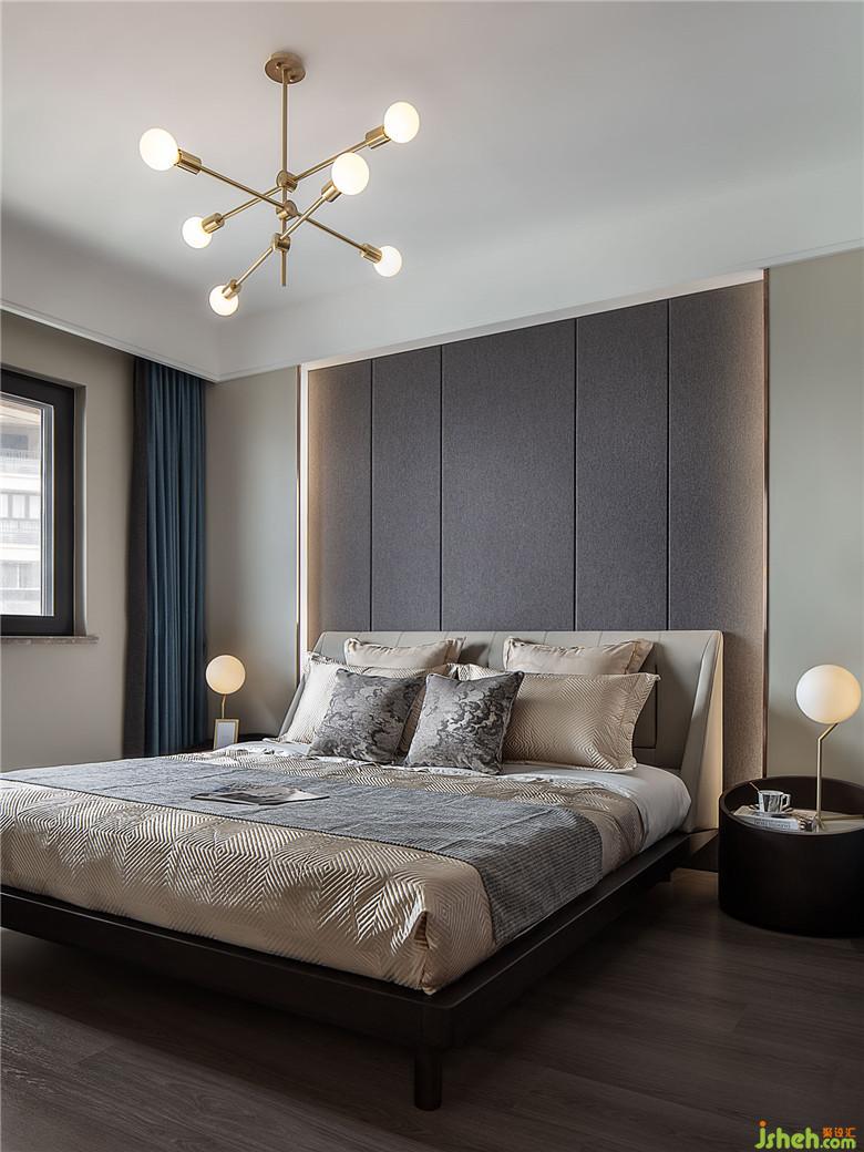 次卧,浅驼色的墙面,胡桃木的柜门,浅灰的床品。室内设计师让空间有限的卧室也显得温情脉脉。整个卧室配色十分简洁沉稳,亦不乏明快。蒲公英吊灯,让卧室又显得有些浪漫。