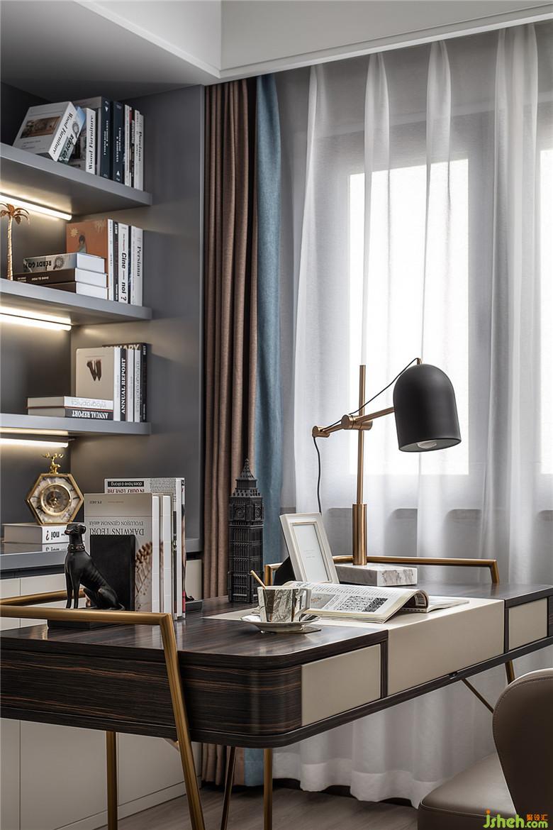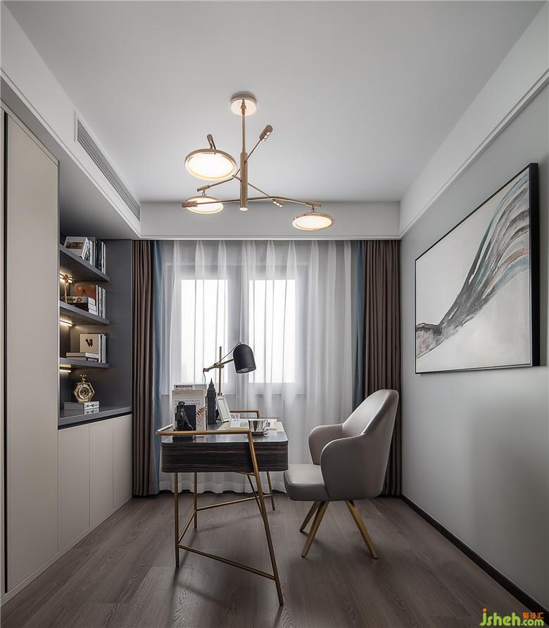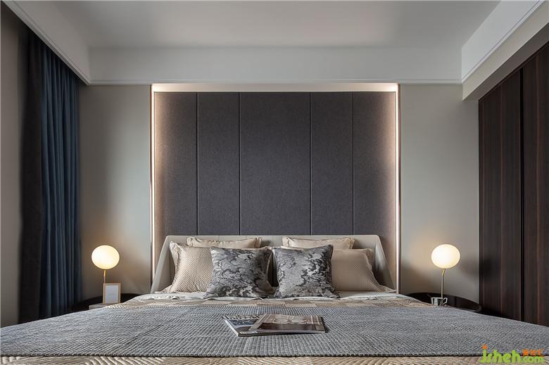 主卧,室内设计师床头硬包的使用仿佛深秋的大衣一样给人以温暖和安全。火柴头状的吊灯,更是提高了卧室的温度。台灯的造型也是跟吊灯相呼应,显出了几分可爱。配色虽然偏沉稳,却不让人压抑。就像中年的人,稳重了,周全了,却还有自己的梦想和感情的回转。