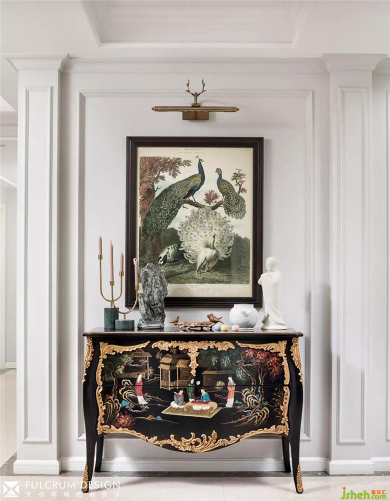 整体美式的框架下,带有浓郁的东方色彩的斗柜和饰品让人眼睛一亮,东西方风格的对撞反而带来别样的风味。
