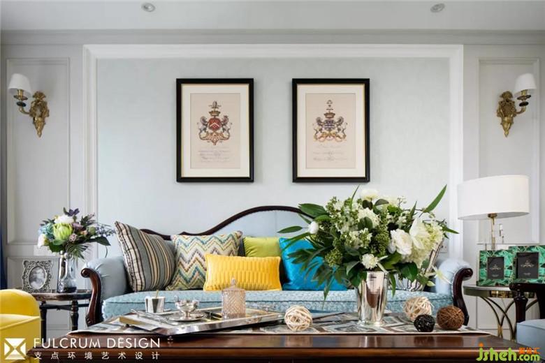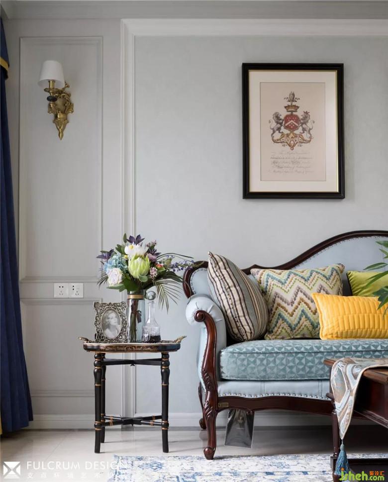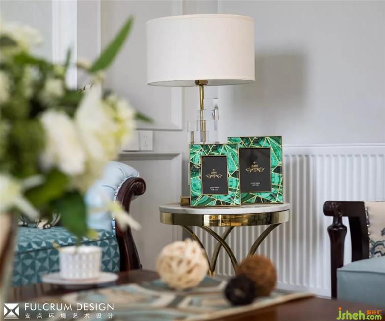 客厅里浅绿的沙发背面的暗纹墙纸配合浅灰的墙面,显得清爽淡雅。带有传统美式元素的家具,纯银的古董茶杯,带贵族族徽的装饰画跟现代风格的墙面大理石,挂饰相映成趣,给人一种时空穿梭感。
