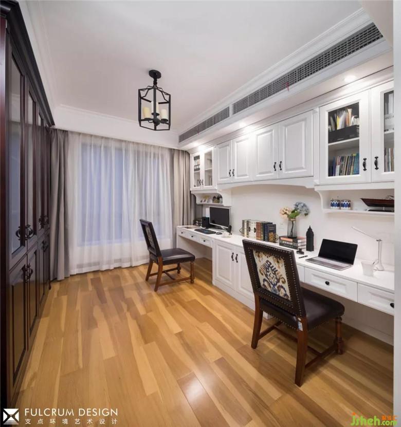 书房不大,但拥有着夸张的超长书桌,为两人同时工作提供了奢侈的空间。