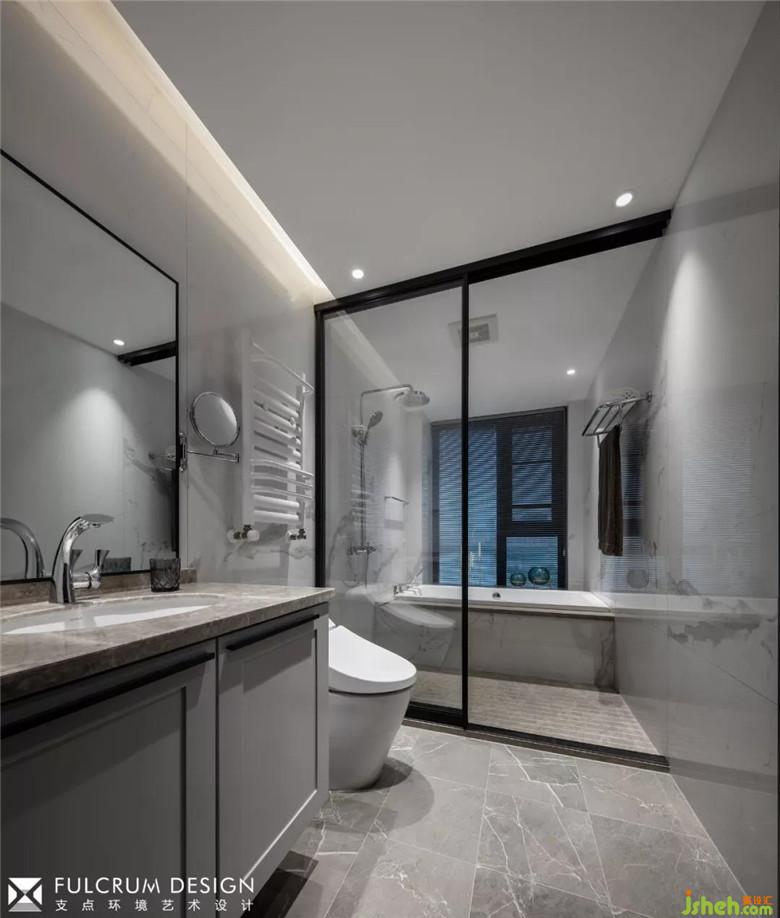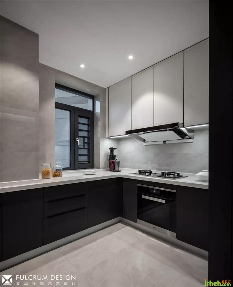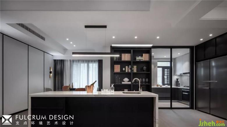 窄边框的单扇玻璃梭门,即可以当酒柜的隔断门,也可以隔开厨房与餐厅之间空间,避免油烟困扰。橱柜采用进口西班牙岩板材质,突出整体现代风格色彩和质感。