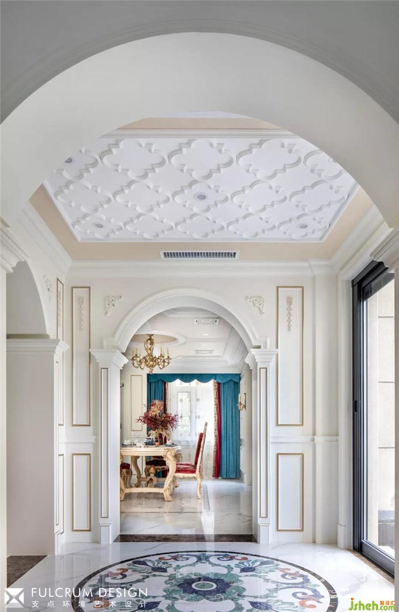 三面拱门,欧式柱托,圆形的地面大理石拼花,白底金边的墙板尽显华丽气质。