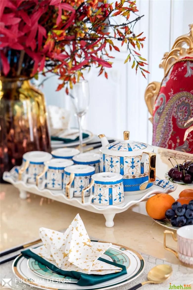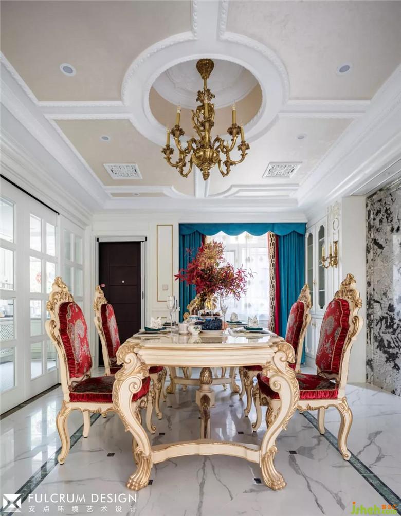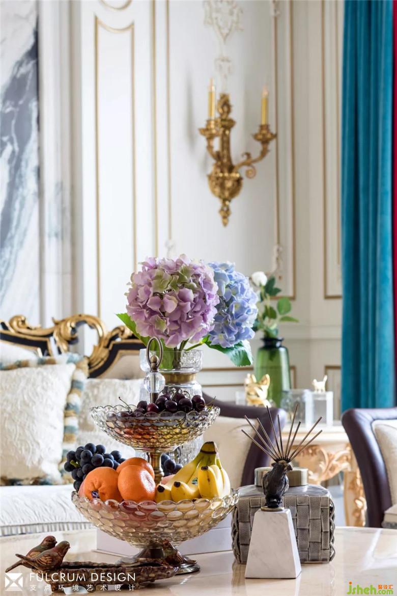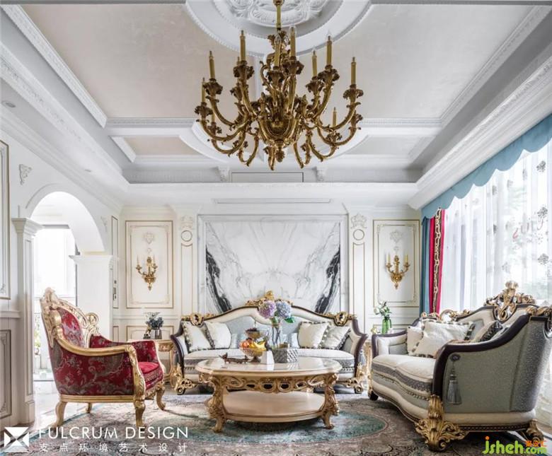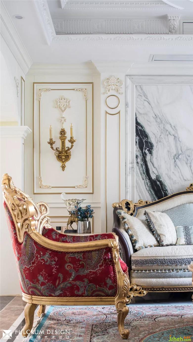 黄铜鎏金的吊灯,红、蓝绸面的沙发,繁复的金色雕花让整个客厅雍容华贵。白色天然大理石的拼接背景显得奢华而不俗。松石色的密织勾花地毯和花团锦簇的各个角落,透着一丝安托瓦内特式的风华绝貌。所有的一切都仿佛将大革命前的凡尔赛宫廷内的歌舞升平带入了现代的居家生活。