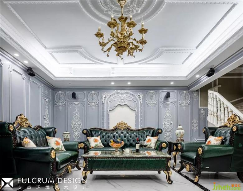 雪松绿的皮沙发配合岩石灰的原木墙板,外加精致的雕花分色工艺,金色的植物雕花点缀其中,恰到好处地将古典与现代糅为一体,更好的迎合了主流趋势。