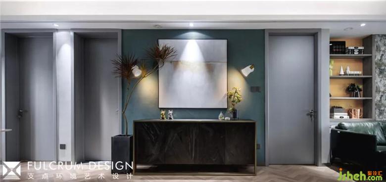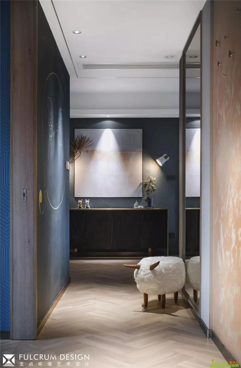 开门见山,有别于一般居室白色或者米色的配色,大面积的带有金属质感的蓝绿色让整个空间显得冷艳而性感。同时地面暖灰色的拼花地板和墙面暖黄色的搭配让冷艳变得温柔,一种强烈的冲突中又存有一份融合,让人有一种心有猛虎,细嗅蔷薇的强烈对比与冲击感,虽然这里只有一只小绵羊 ~ 过道可擦写的黑板漆和银镜对视,空间和功能互为一体。
