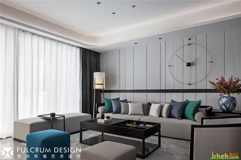 沙发背景墙是白色刷漆壁布,腰线处点缀黑色线条,是黑白交织的家中的一部分。刚中带柔的观感,装修公司为客厅注入一丝浪漫与温柔,营造舒适、温暖、柔和的氛围。