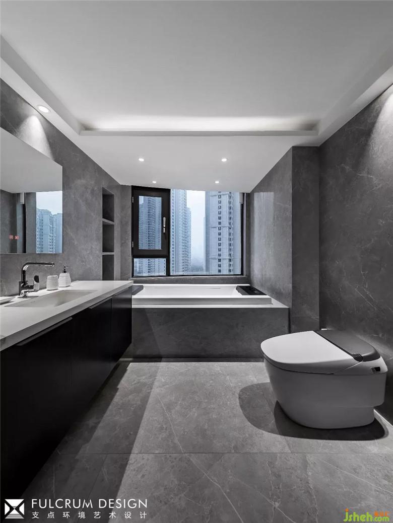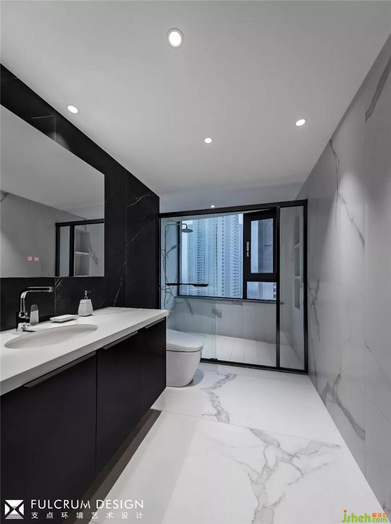 卫生间,色彩跟线条都遵循着极简,传达着一种细致又随心的生活方式,装修公司大量运用黑色增加空间对比度,让空间呈现出一种强烈的视觉冲击感。