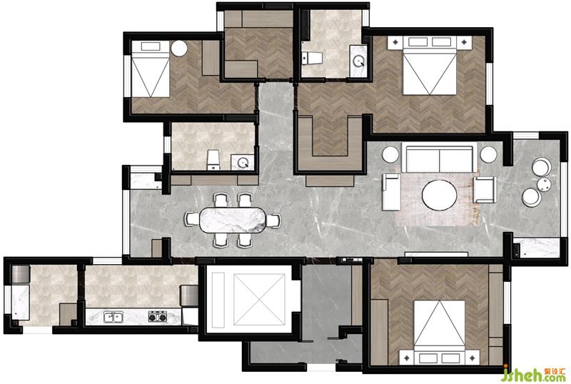 2、储藏空间配置安排。客餐厅公共区都配备储藏柜以满足后期零碎物件收纳,便于后期保持居家整洁。房间内为男女主人分别配备了衣帽间,以满足两位时尚达人的衣物安置需求,预留的两间次卧室也各自配套了储藏柜。