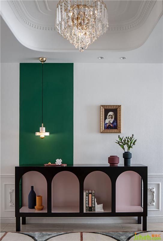 白色的墙面勾勒着精致的线条,刻意用不对称的手法局部铺设了一片祖母绿的跳色,增添了时尚的气息。精心挑选的玄关柜,拥有建筑连廊的美感,黑加粉色经典配色也与空间相得益彰。金色的吊灯与画框,再配上精致的饰品搭配,给空间增添了点睛之笔。