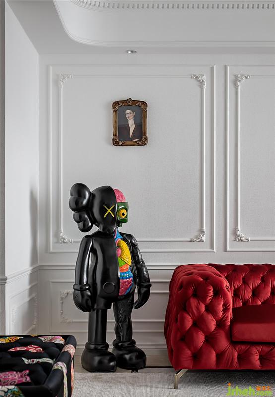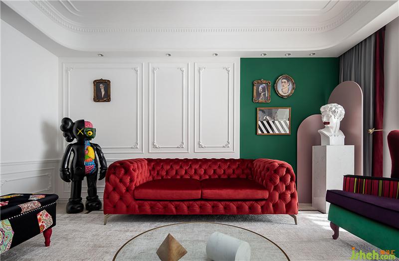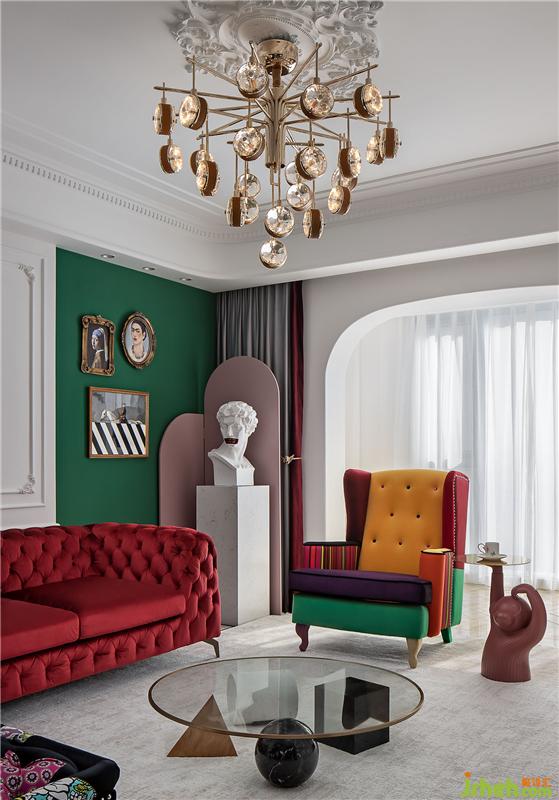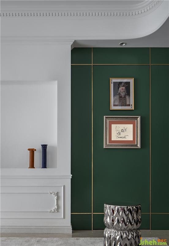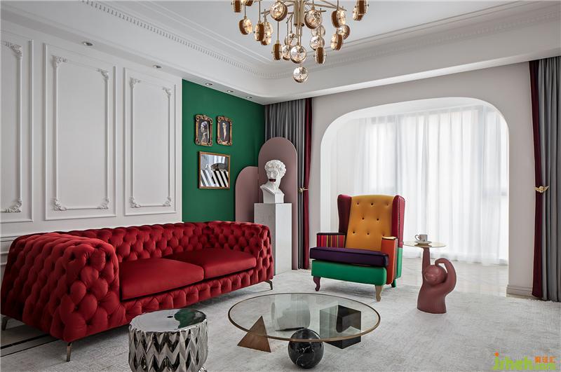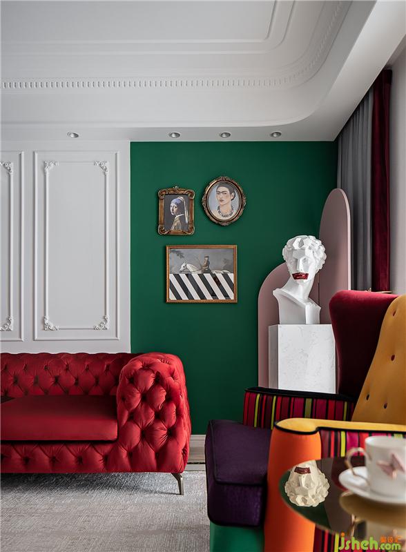 ▲这是一个色彩丰富的客厅。亮白色的环境打造了一个透明的舞台,纯净的墙面上线条勾勒出优雅的法式风情,浓烈的红色天鹅绒沙发与局部的绿色墙面打造一个充满浪漫与热情并存的派对乐园。