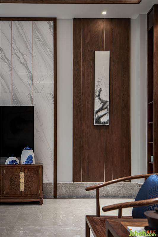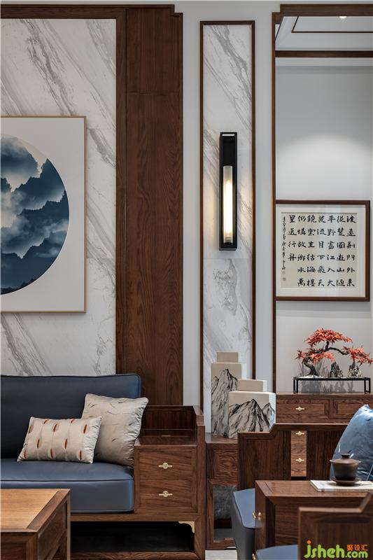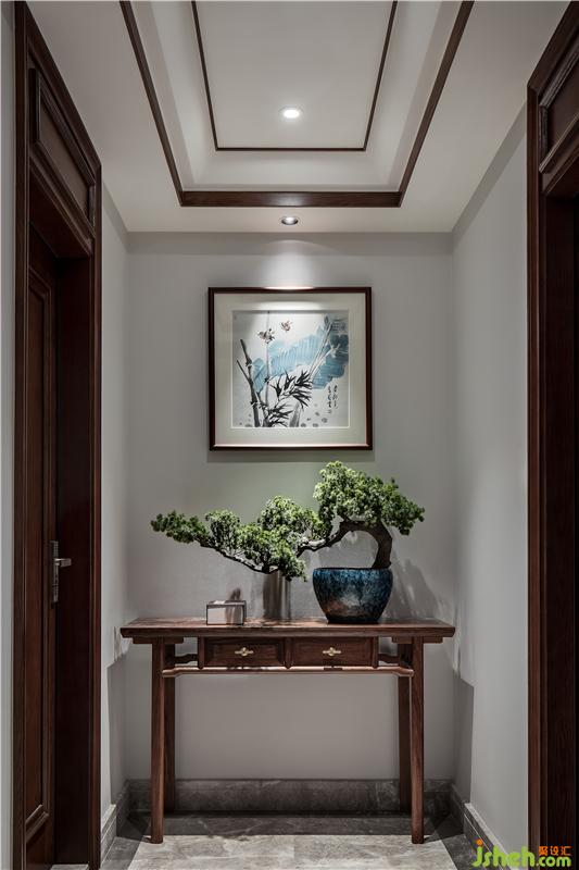 ▲一处幽静的玄关。几案上青松英姿傲意、一幅枯笔挂画引入空间,将它们放在恰到好处的位置,营造合适的光影,顿生一股闲寂的气质。
