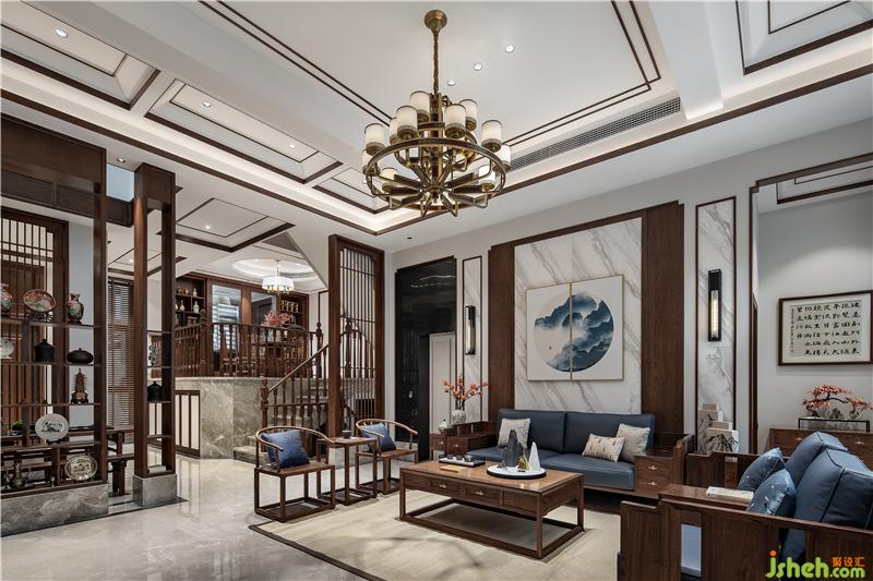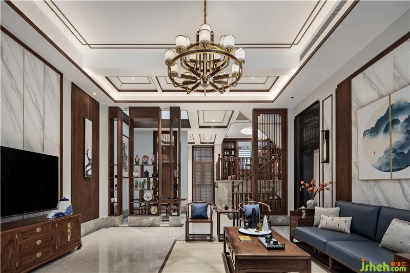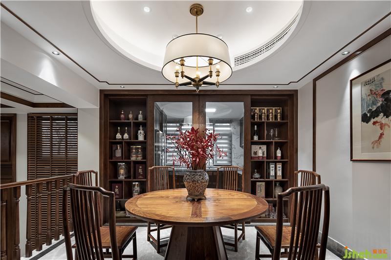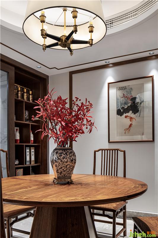 ▲拾级而上,置身于餐厅。圆形天花搭配传统圆桌体现中国传统空间形式的概念美,灯笼样式灯罩、青花瓷与红色枫叶的陪衬下,韵味自发,袭面而来是青木之香,入口之间是五谷之味;纵使风尘仆仆归家,落座共餐,时间恰好。