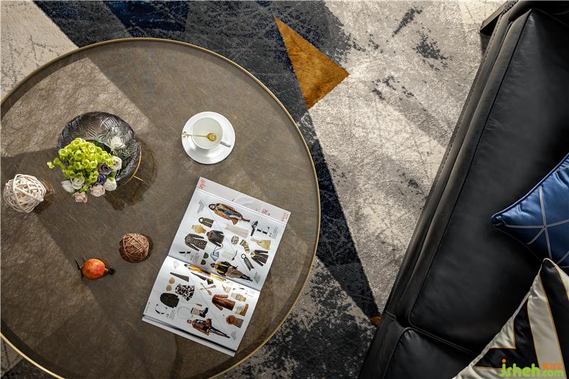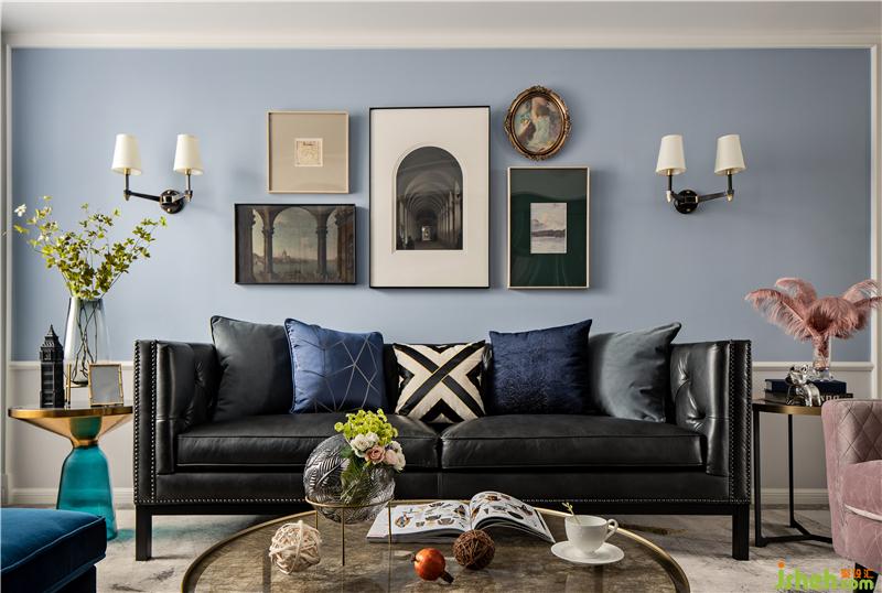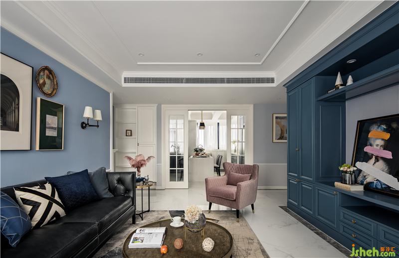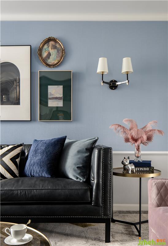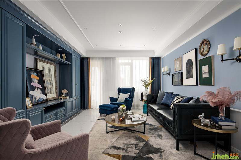 ▲而点缀其中的灰粉单人沙发,亮蓝玻璃边几,茶色玻璃茶几,INS复古风的挂画,切割花纹的地毯……则带出了一丝活泼时尚的意味。