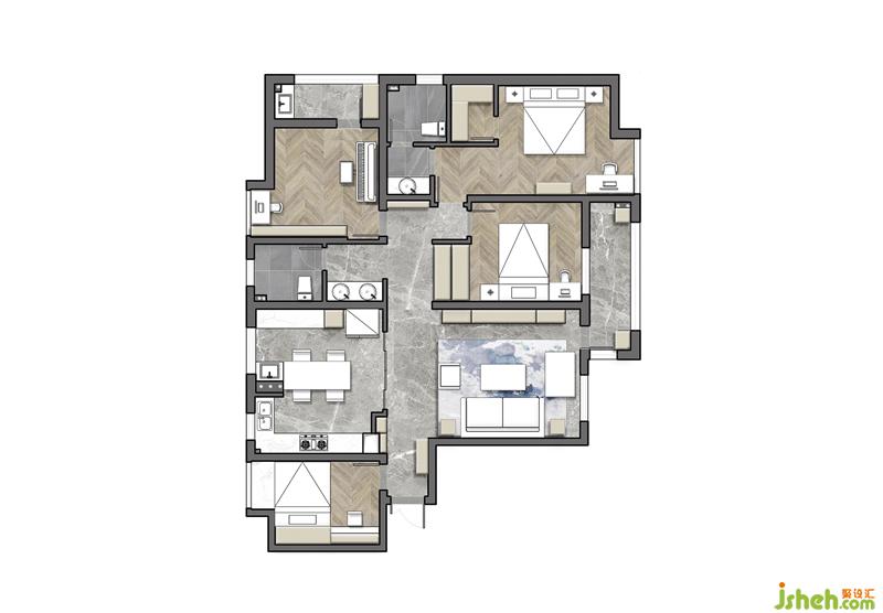 另外,在一些细部,设计师也进行了处理,比如多利用客餐厅墙面,“挖”出了多个柜子架子壁龛,优化了原始走道空间,让原来的主卫也有了干湿分区,让主卧有了衣帽间,让儿童房也享受到了更多的光线……