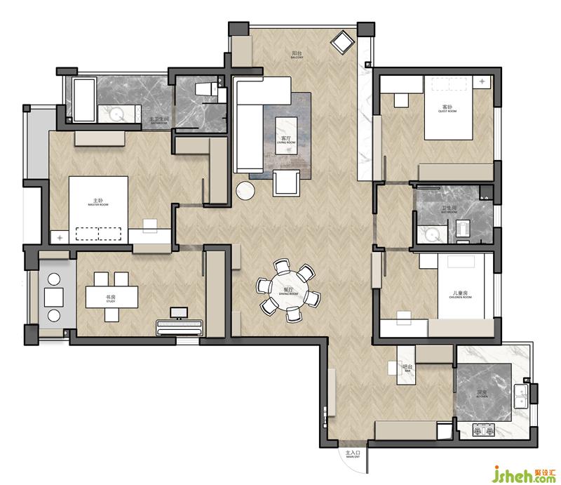 这是一个360°一线湖景房,每个房间都能欣赏到漂亮的风景。房间左右分区,结构清晰。