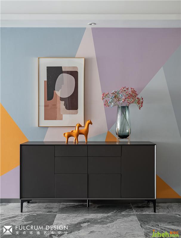 马的橘色和墙壁的橘色互相呼应,拼色的壁画在这个开阔的空间内成了。没有造型的焦点,抽象的充满爱意的装饰画能很好的柔化几何线条产生的割裂感。红蓝相间的满天星能让主人感受到回家的热情。