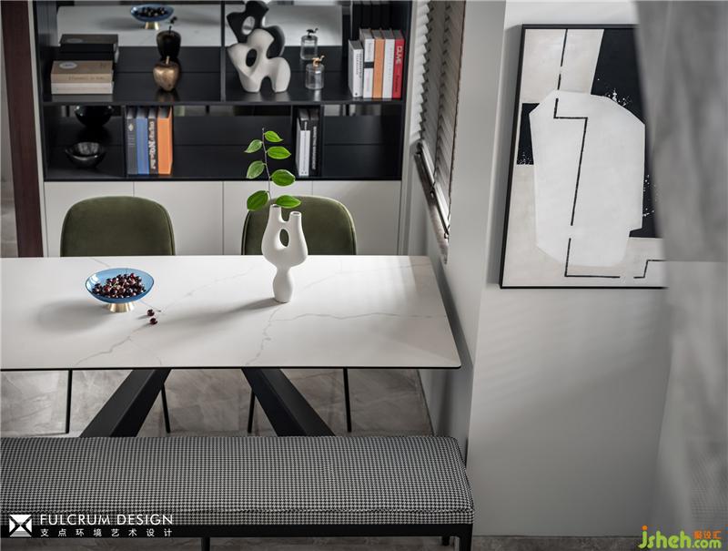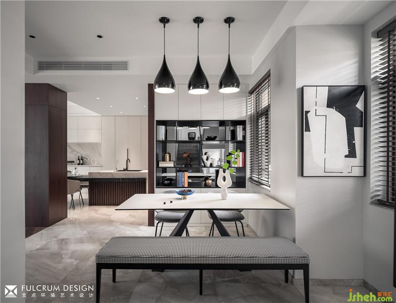 在距离厨房更近的地方,设置供业主一家三口平常吃饭的餐桌,设计师在置物架背板用镜面材质,扩张空间视觉感。