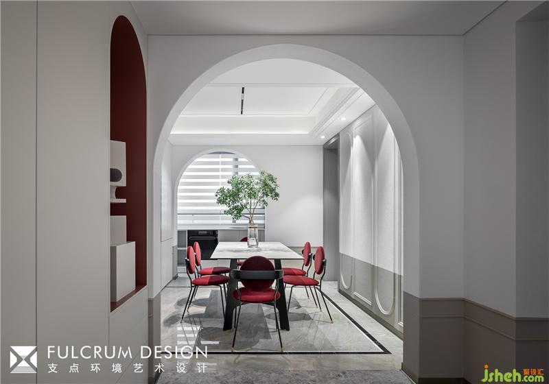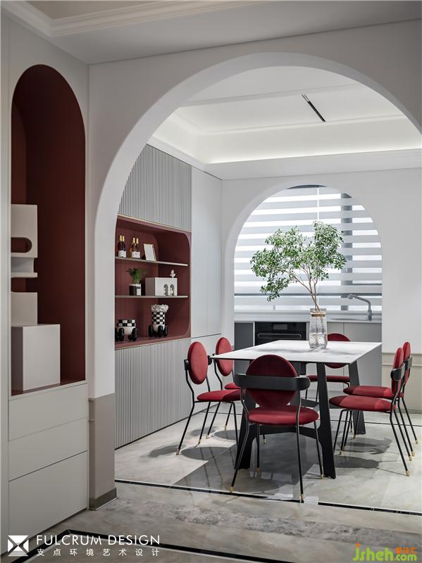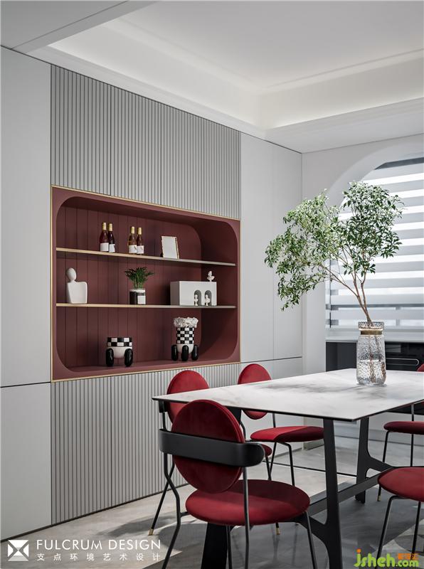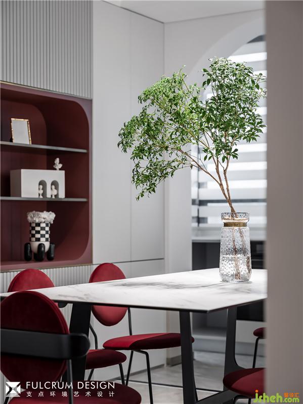 框架感餐桌椅缓解餐厅面积紧张,增强空间视觉通透感。一年四季、三代五人,食自己所爱,观生命至亲。不同质感的红色渲染烟火气,使其愈发浓烈。