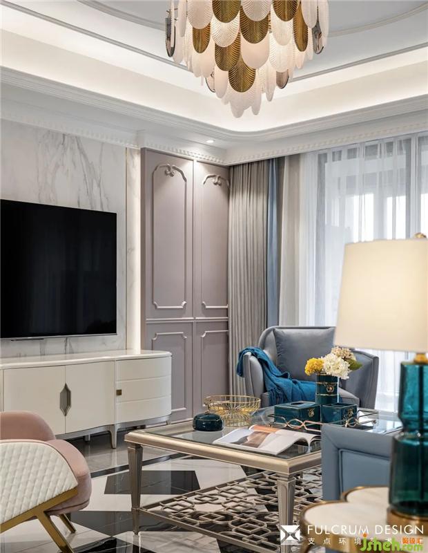 客厅内,设计师摒弃了传统欧式的厚重感,取而代之的是现代轻奢感的软装。曲线流动感的电视柜,金属框架通透感的茶几,尊贵的格调,轻快的空间感受。