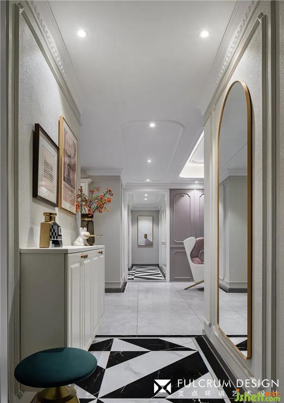 镜子的反射原理既能扩张空间尺度,还能反射光线,解决原始户型玄关采光弱的问题。黄铜边框与换鞋凳材质相互呼应,一进门就奠定了情怀复古,轻奢生活质感的居住环境。
