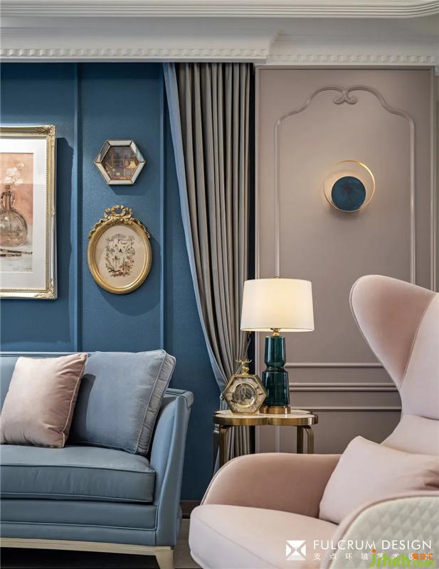 提取欧式布局特点,完全对称的墙面造型与边几、摆件,显得空间大气、稳重,仪式感十足,也把暖气设备完美隐藏在沙发后面。莫兰迪色系搭配给家增添了温柔、亲和之感,墙上组合挂画随性、浪漫,记录生活美好。