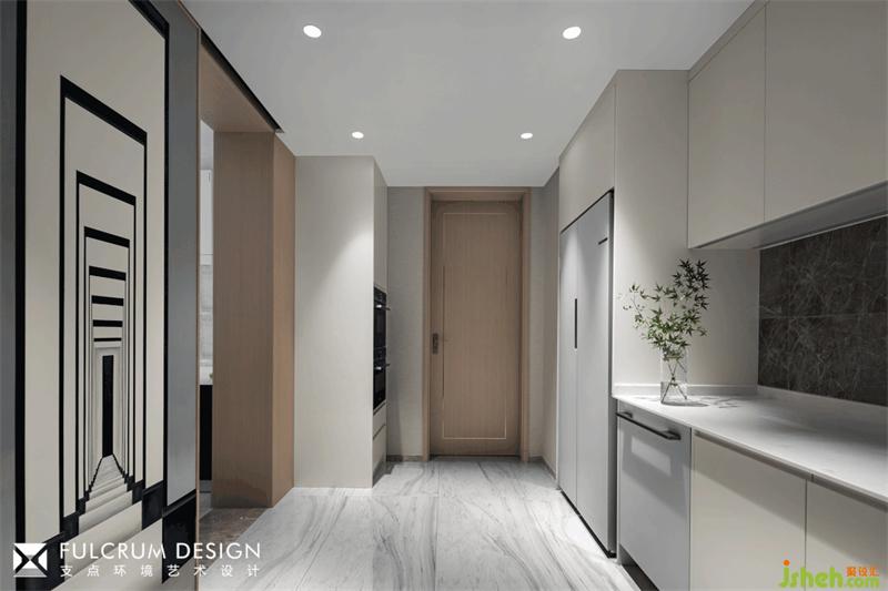从空间特性和视觉感受上考虑,选用天轨移门,设计师特地请插画师,现场设计并绘制空间感极强的装饰画饰面,使厨房使用起来更便利。