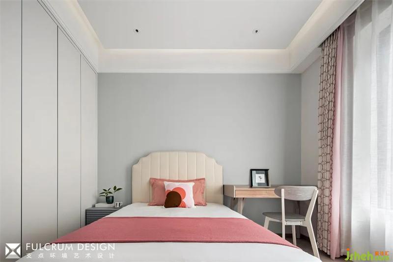 两位公主还小,设计师希望满足她们的童年公主梦,在床品布艺、软装上选择了较为鲜艳的粉色。