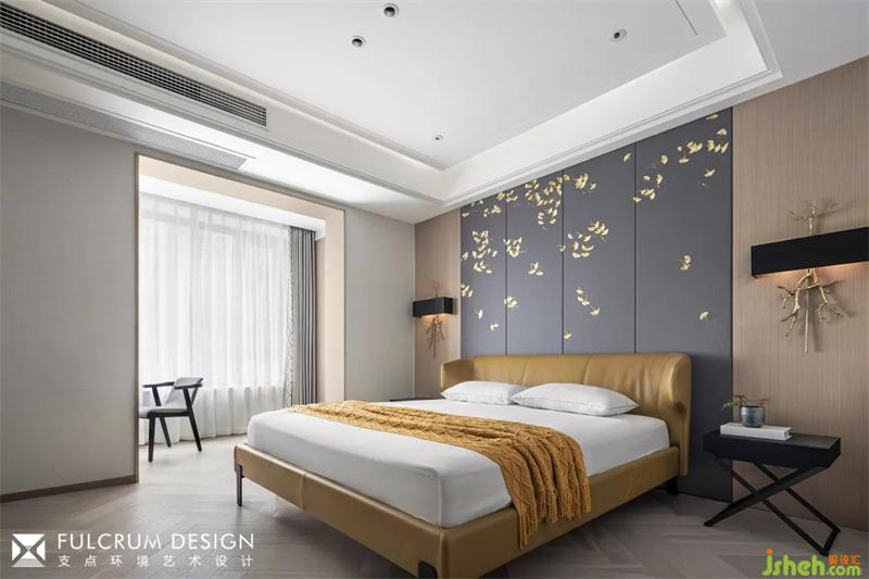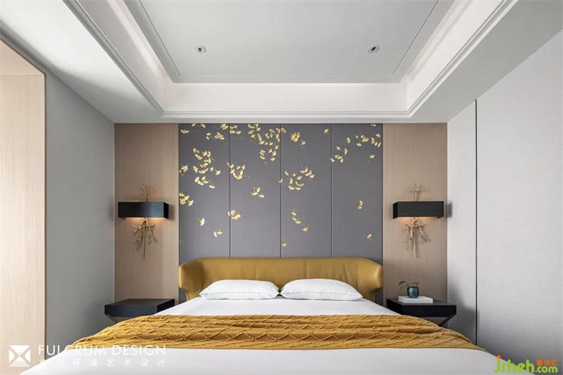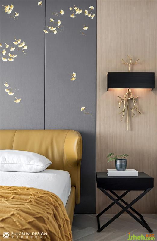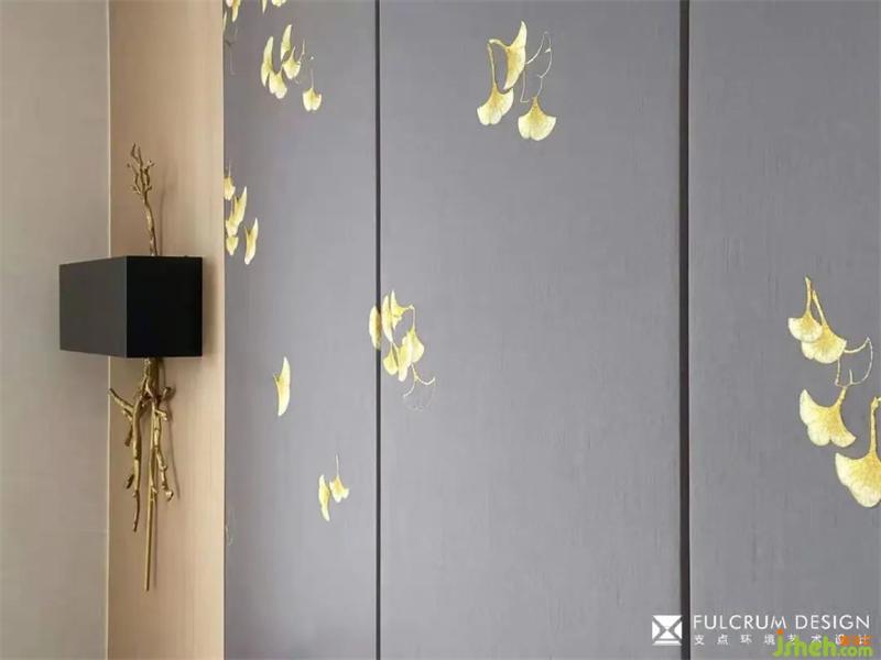 床头硬包上的刺绣银杏叶缓缓飘落,与原木饰面拼接,是自然与自然的交融,壁灯上的树枝造型把自然美学的空间氛围推到极致,是舒缓、是平和、是岁月静好。