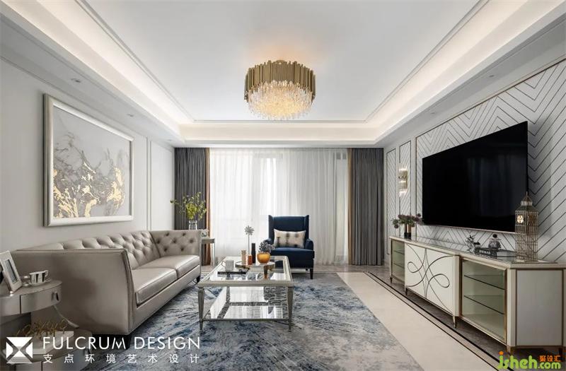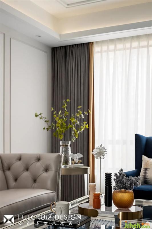 茶几以大面积玻璃材质出现,存在感减弱,显得空间更宽敞,奶白色铺叙柔和、雅致的视觉感受,以灰色窗帘增添空间沉稳的气质,克莱因蓝单人沙发,带来清爽之感,与地毯在色彩上形成呼应。