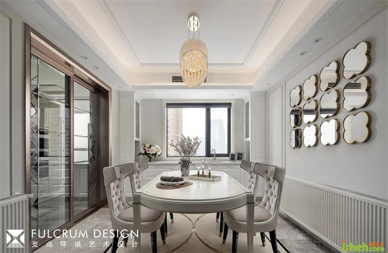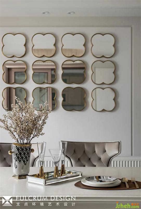 设计师把暖气设备悬挂,隐藏在白色墙面之中,把梅花装饰镜以阵列组合的方式排布在墙面,吸引人的注意力,更加弱化设备存在感,镜子金属边框与厨房梭门形成呼应。