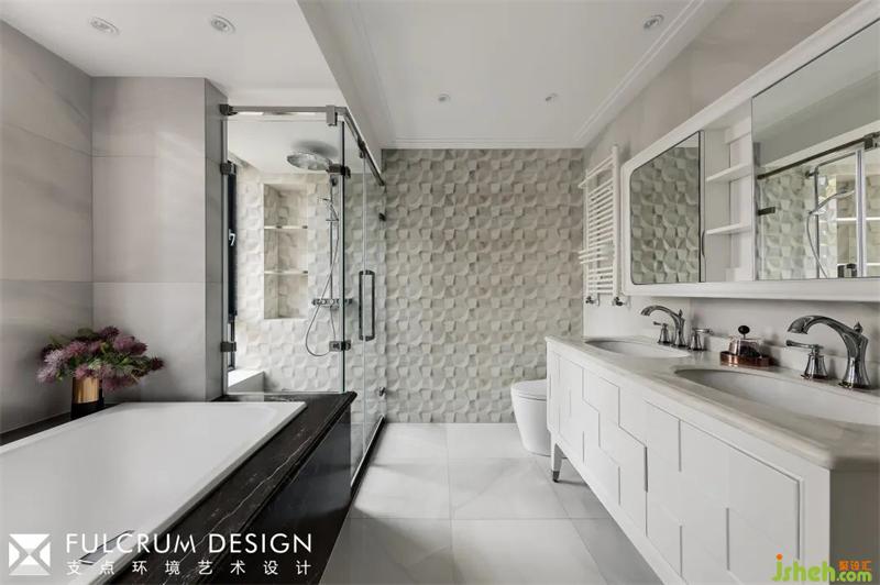 泡澡是业主一直以来的习惯,设计师特地把浴缸相对外置,与窗户相接,营造更好的卫浴氛围,石材全包裹一是为了方便打扫卫生,二是尊贵感的体现。