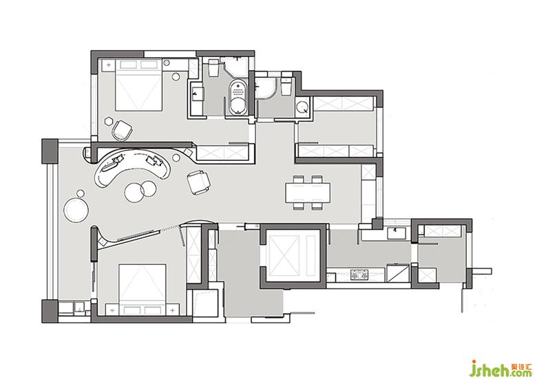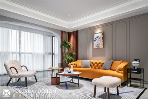 沙发旋转30°,居者在家中可直面江景,「喇叭形」的客厅布局顺势而生,延展客厅视距的同时仍保留了南向次卧室的衣柜长度。