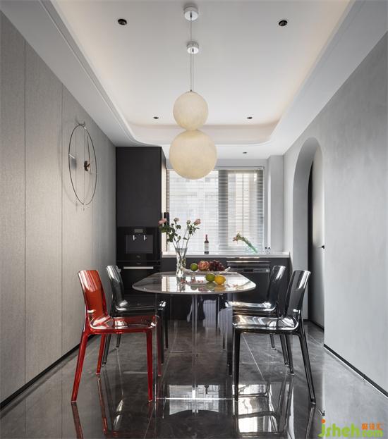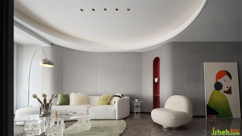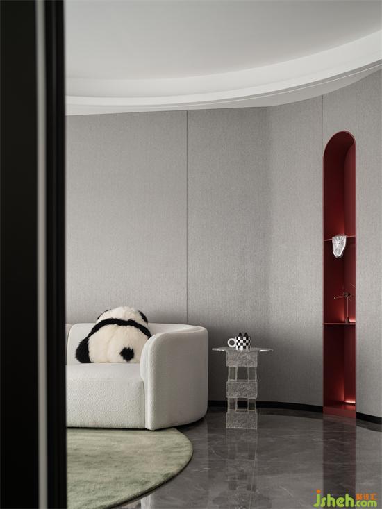 喇叭形客厅、DIY茶几、好多弧形,"不规则"是这个家的初印象;纯粹的灰调空间里,有亮丽的红色、清爽的绿色,"色彩顽童"是这个家活泼的本性;亚克力、玻璃砖、不锈钢、艺术漆、布艺硬包……家装设计"材料学者"是这个家的本质。