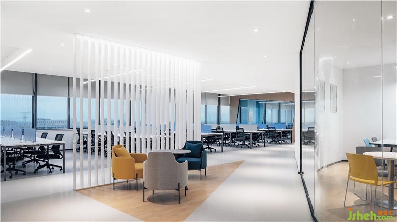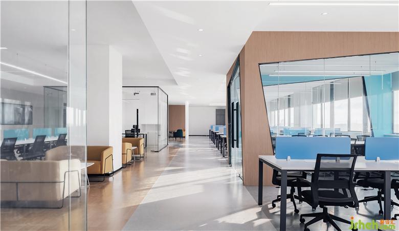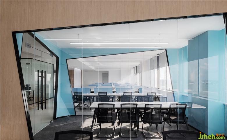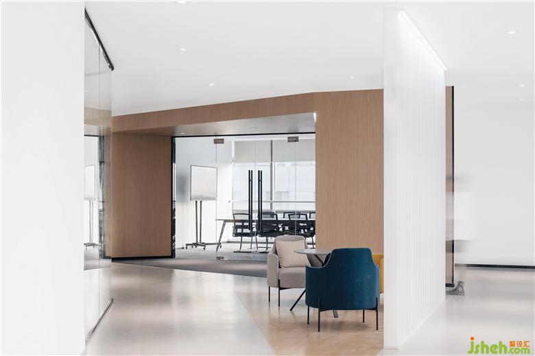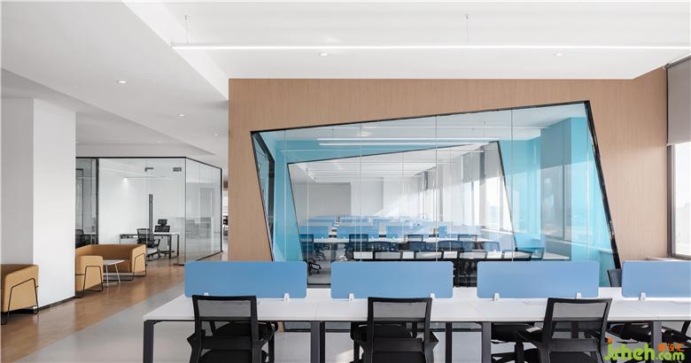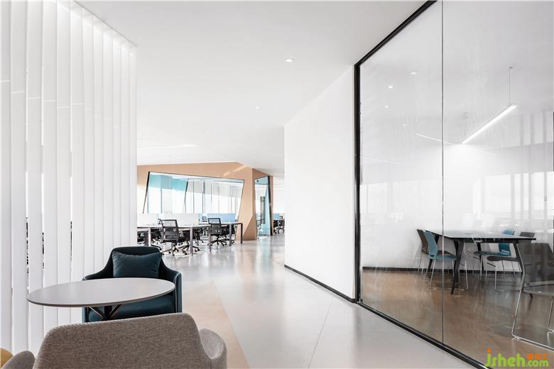 大面积玻璃代替厚重墙体,轻薄的线条边框隐匿其中,会议室的物理分区体量被减至最小。“透明盒子”的结构被光线打通,一个高端质感迭代空间内,空间与工作发生紧密而富有无尽创造力的未来。开放式的办公空间让传统的工作日常变了模样:开阔区域进行集中讨论,围合的空间创造偶遇与快速协作,格子空间以便集中精力、促发深度思考,更精准地把握高效办公的刚需与日常心理感官的平衡。