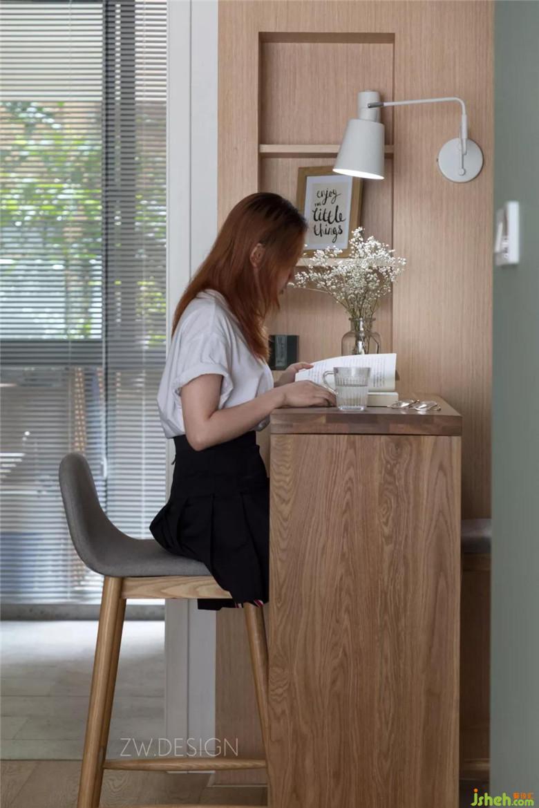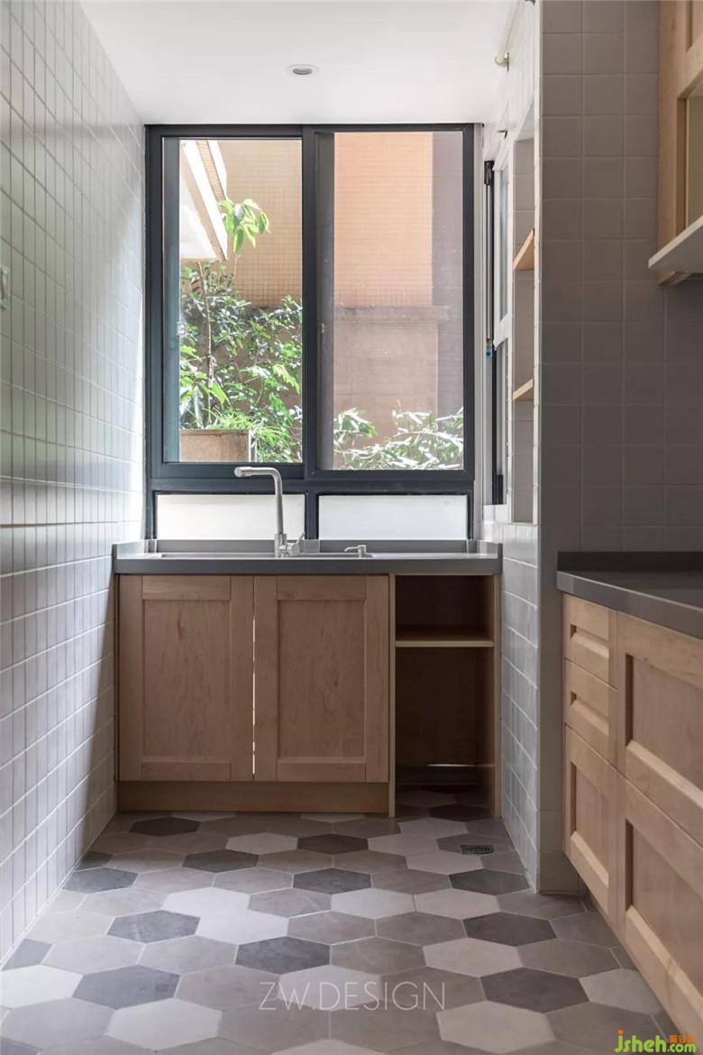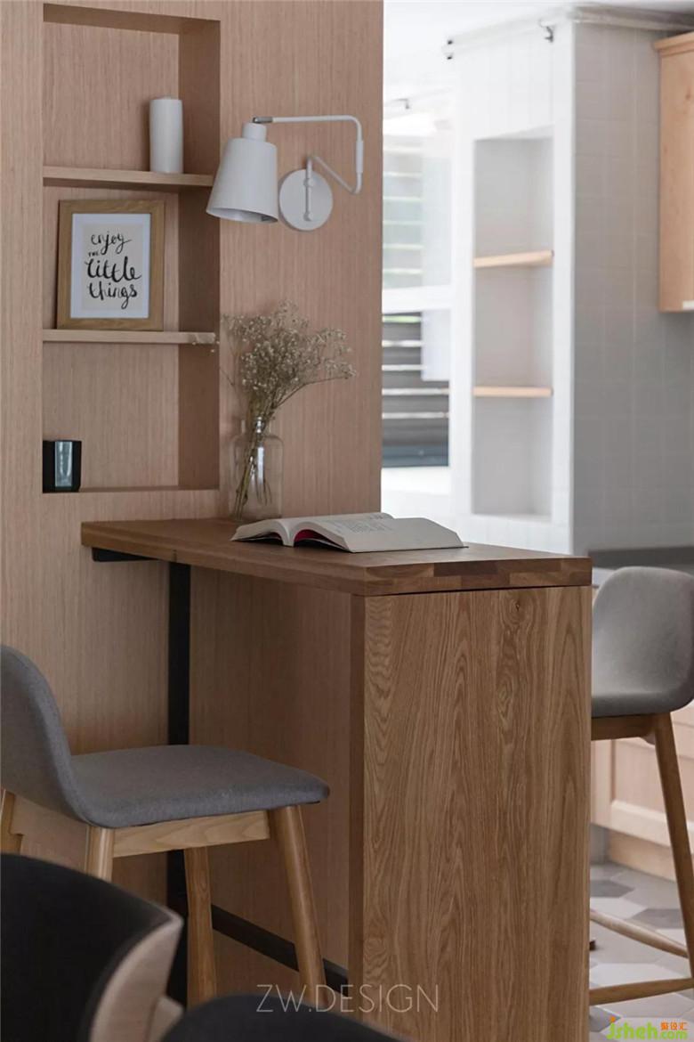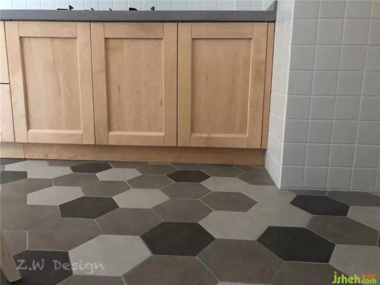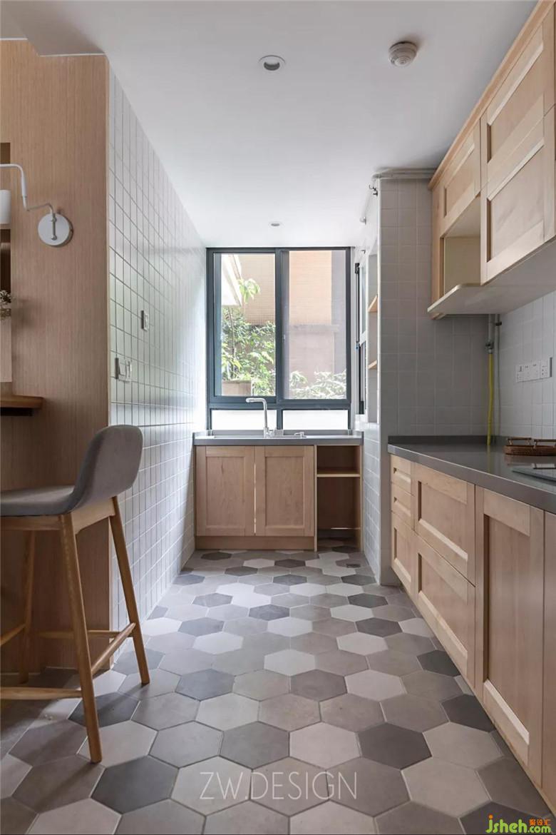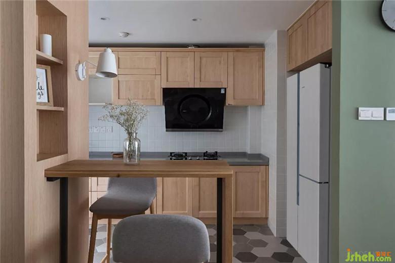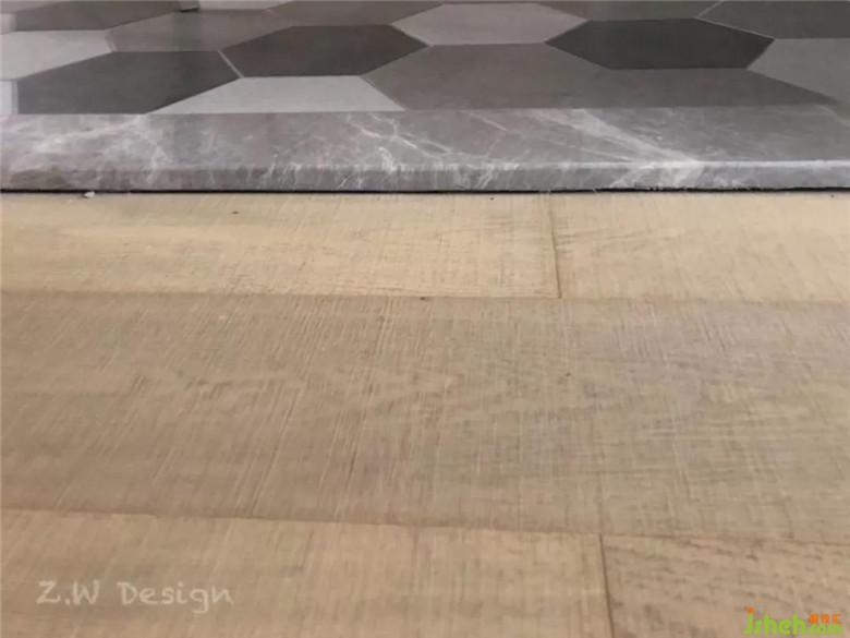 厨房与餐厅的地板衔接处,将整块木地板嵌进石材内,可以不使用扣条固定同时更加美观耐用