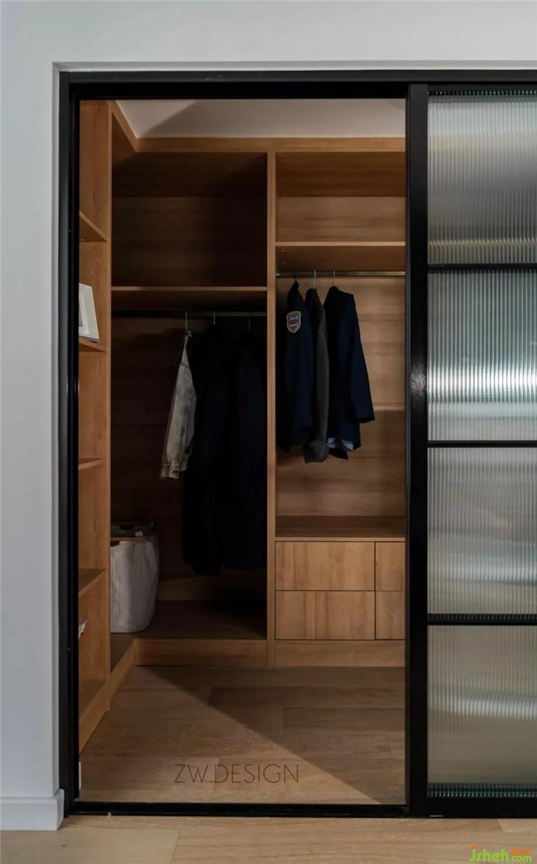 衣帽间里衣柜没有做柜门,作为一个独立的封闭空间,推拉门起到了隔绝灰尘的作用。