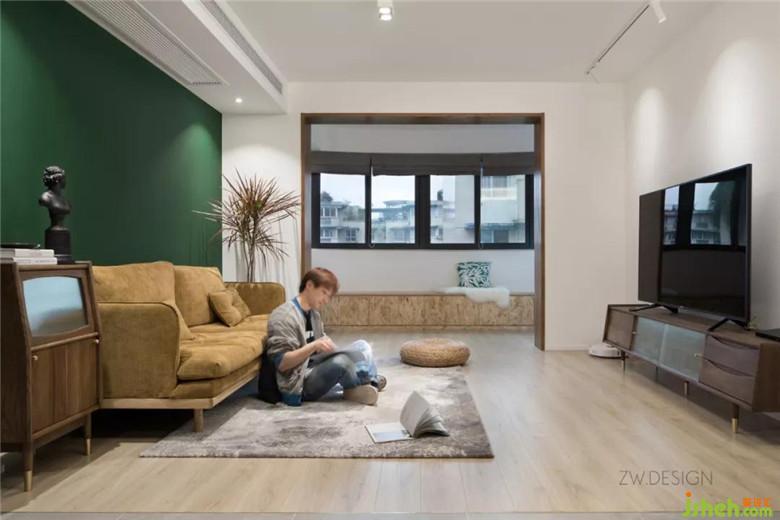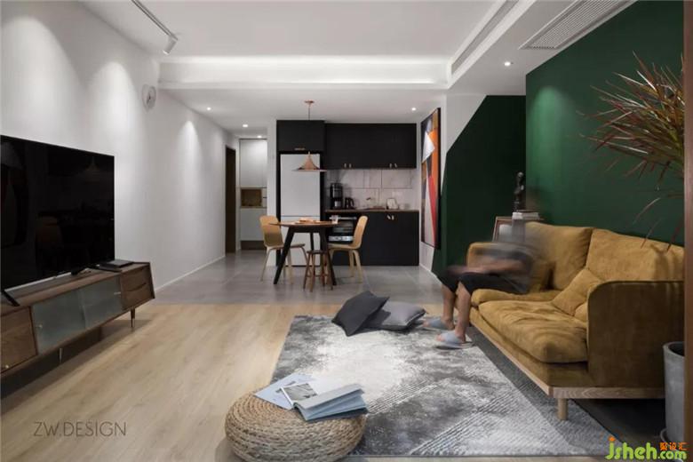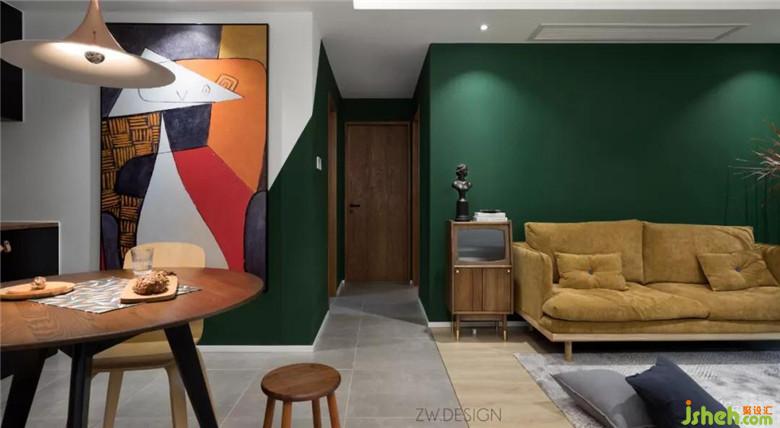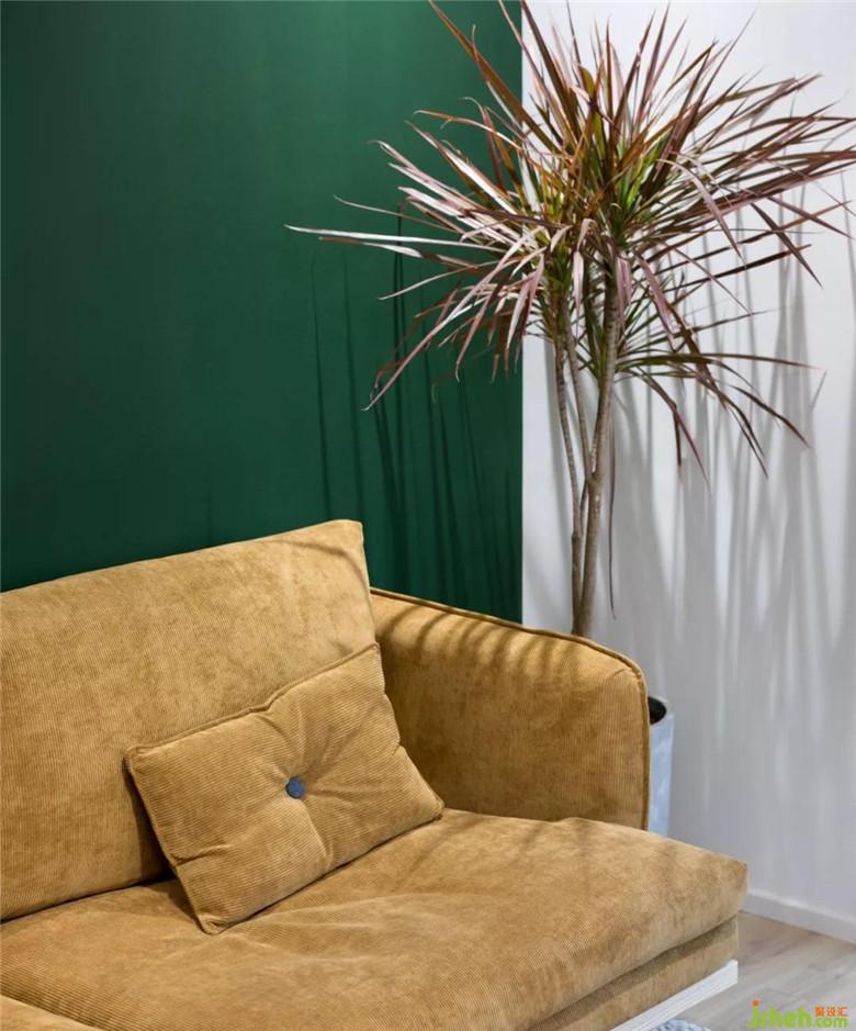 红色叶片的千年木植、讲黄色灯芯绒面的沙发与墨绿色墙色,延续了整体空间的配色。致物设计