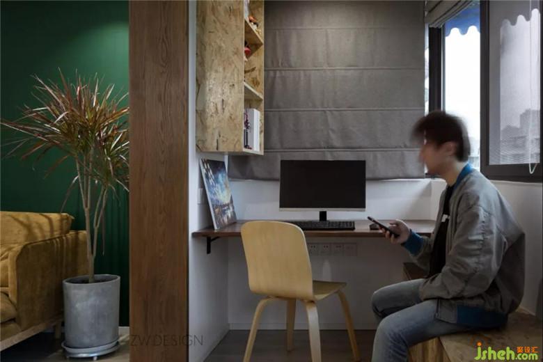 弧形的阳台现场制作了欧松板长凳,拉直了空间,也增加了储物。
