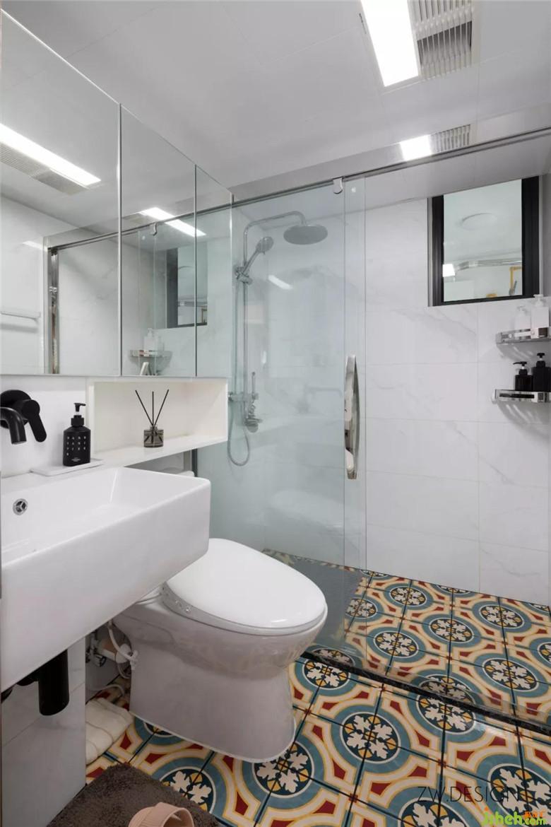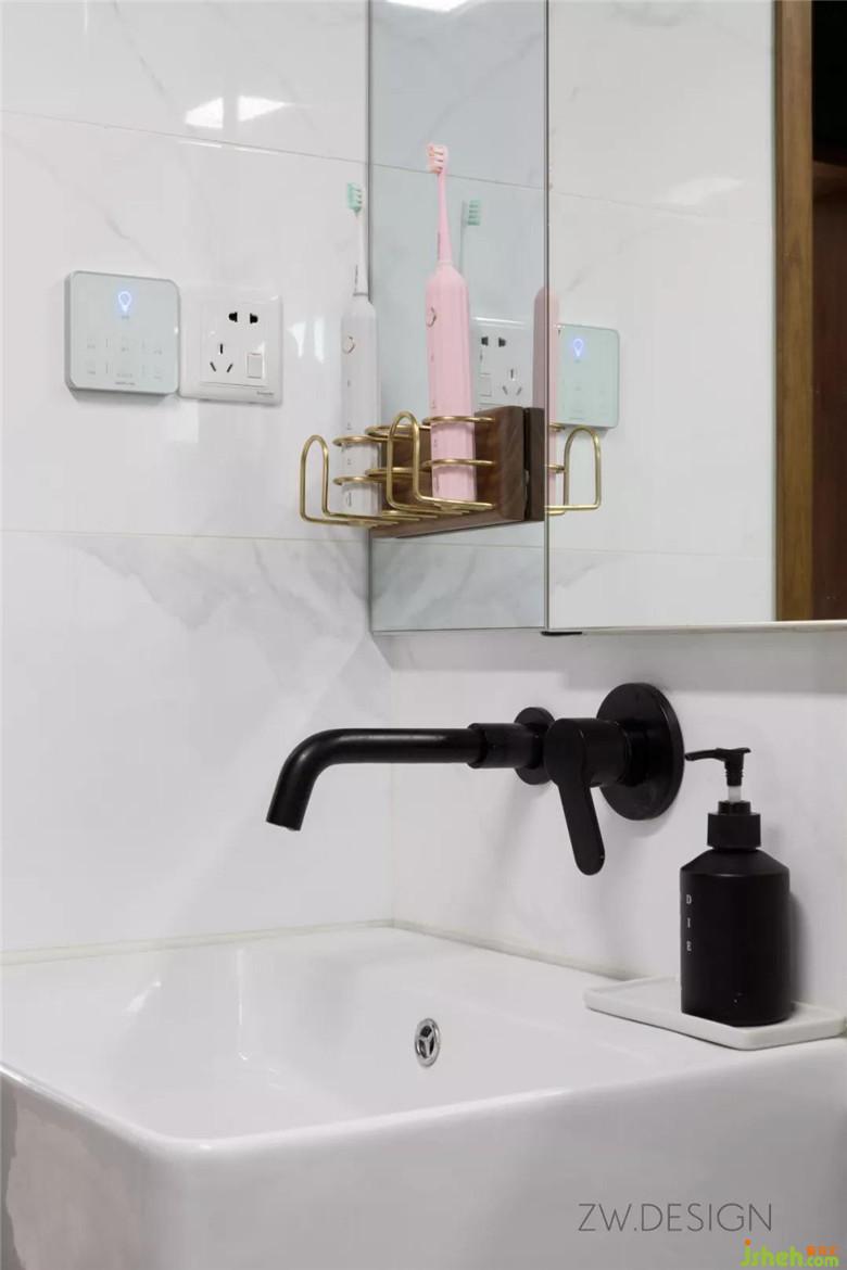 壁挂式洗脸盆、龙头和墙排式下水,解决卫生死角。镜柜遮蔽了下水管,同时做了加长设计,通过大面积的镜面,和白色调的瓷砖,视觉和心理上拓展了卫生间的空间。