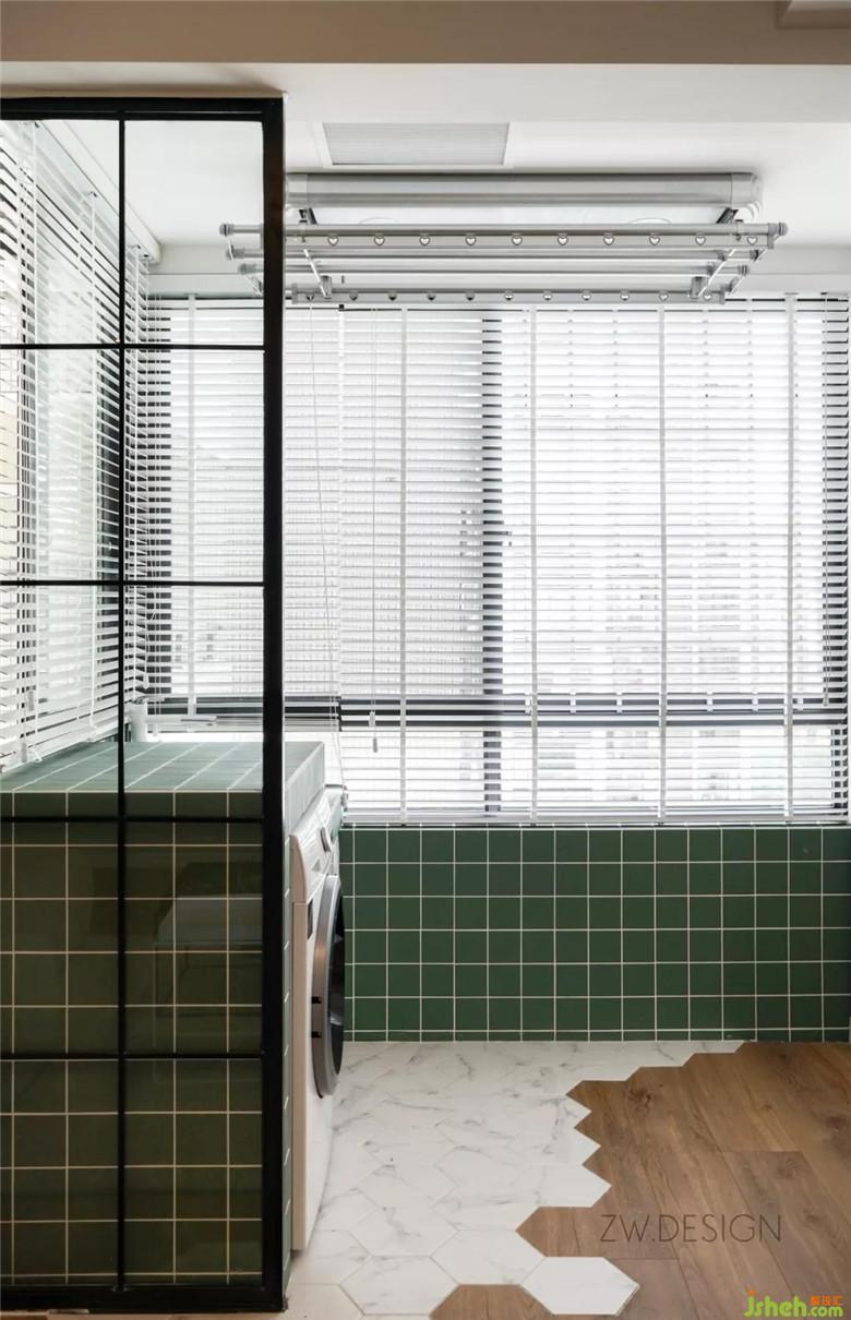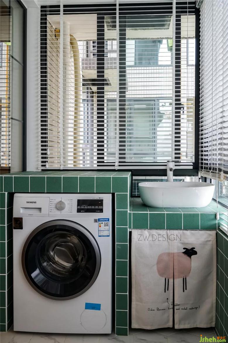 绿色小方砖铺设生活阳台,让空间区域划分更明确更突出。现场泥作的洗衣机框架,让洗衣机嵌入框架内,整洁又美观。安装百叶窗,不仅起到调节光线的作用,还增加了空间的线条感,显得简约大方。