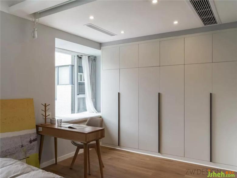 深色的床头背景墙设计,不光可以提高睡眠质量还可以摆放一些装饰小物件,美观又实用。两个次卧连通为一个大主卧,在床尾一侧利用一整面墙打造一排脏衣区,利用原始户型的过道设计通过型衣帽间,方便沐浴前更衣。整体效果统一,房间也变得开阔。