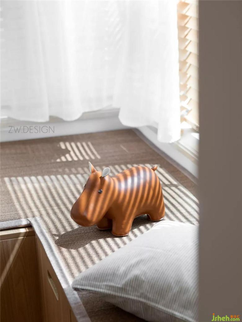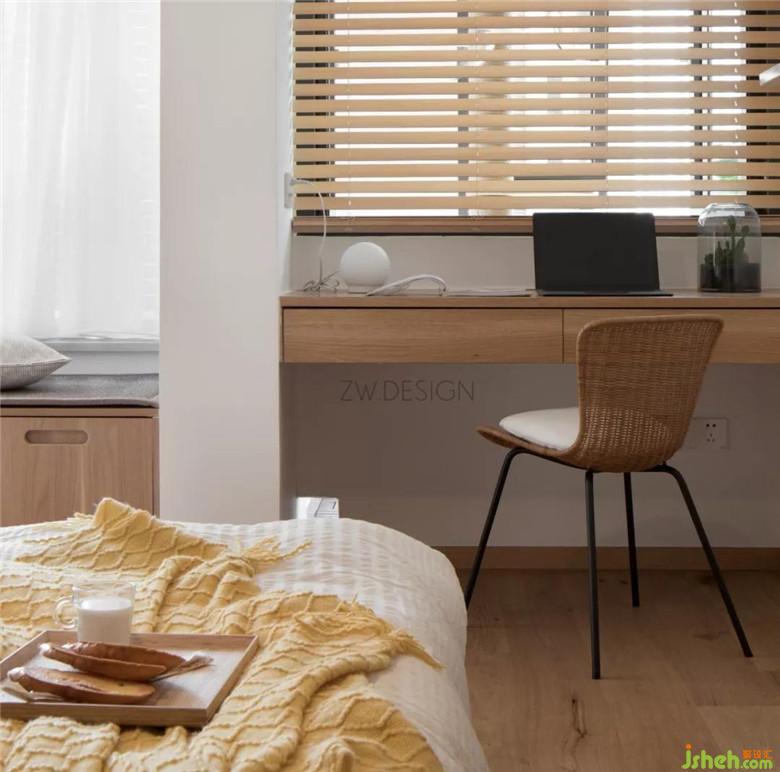 在书桌下专门为猫留了猫洞,与宠物近距离亲近,阳光透过百叶窗倾泻到卧室的每个角落,与爱的他们共同呆在一个空间完成所有的事情