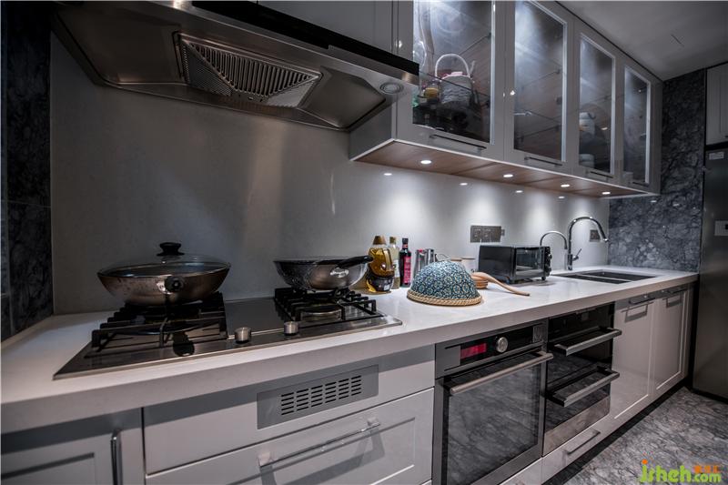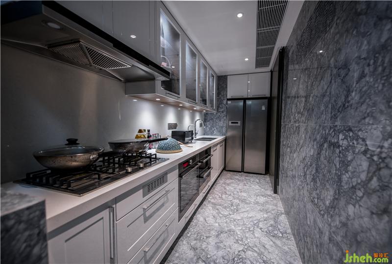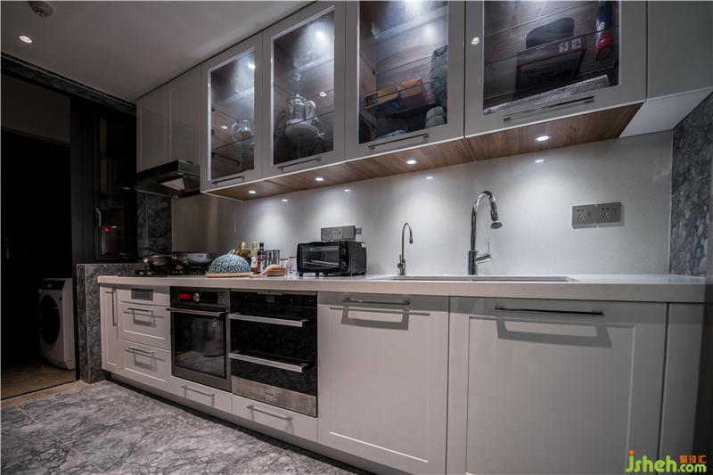 “一人巧作千人食,五味调和百味香。” 厨房使用了大理石大面积铺陈,搭配灯光,营造干脆简明的现代感。靠墙橱柜的打造更加充分的利用了空间,让主人日后生活更加方便。