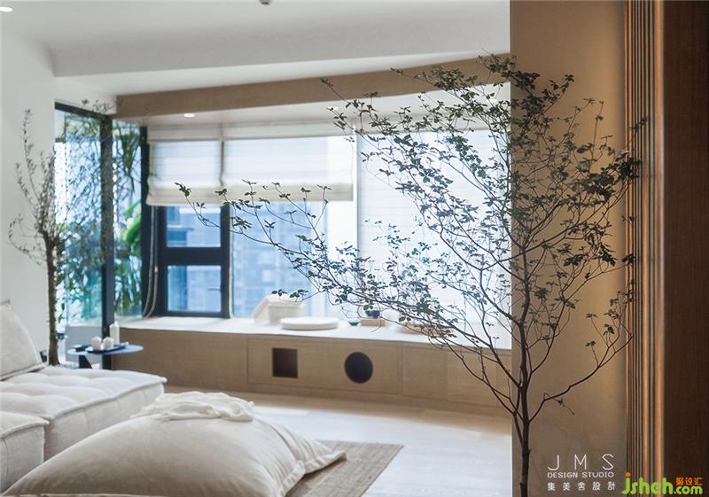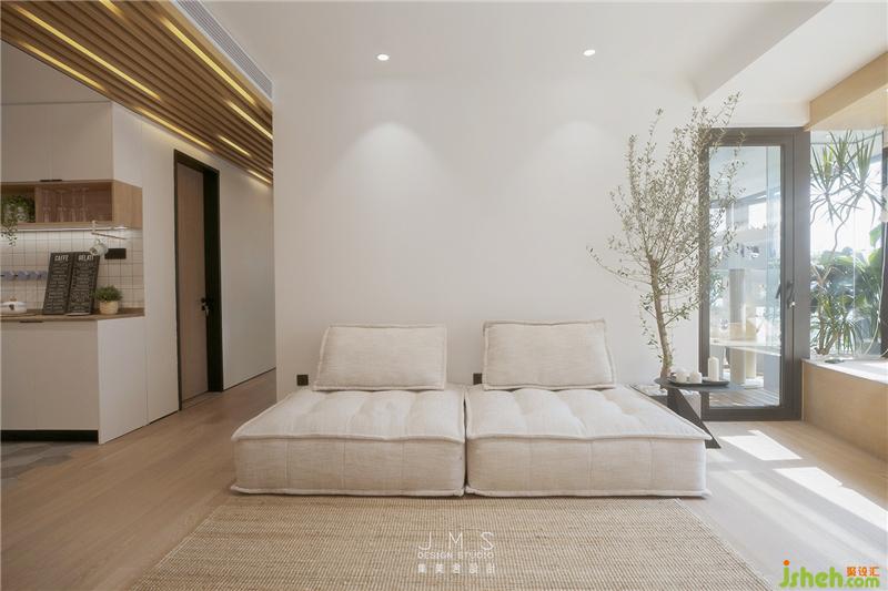 改造结束后的客厅充满了日式的诗意和悠闲。木色的地板、阁柜、桌台,白色的软包布艺沙发、柔软的抱枕,以及一览无余的洁净墙面,点缀着淡雅的绿色,简单的装置和铺陈,空间的雅致彰显,让拥挤浮躁的内心也有了留白。原木色的通道嵌入流动的灯光隔开外界与室内,营造如自然般的光感呈现,匆匆前行的脚步也在这里开始变缓。